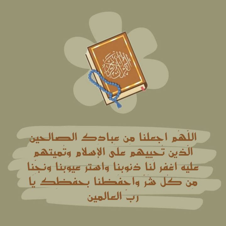 - اللَّهُم اجعلنا مِن عِبادِك الصالحين الّذين تُحييهم على الإسلام وتُميتهم عليه اغفر لَنا ذنوبنا واستر عيوبنا ونجِّنا مِن كُل شَرّ واحفَظنا بحفظِك يَا ربّ العالمين.