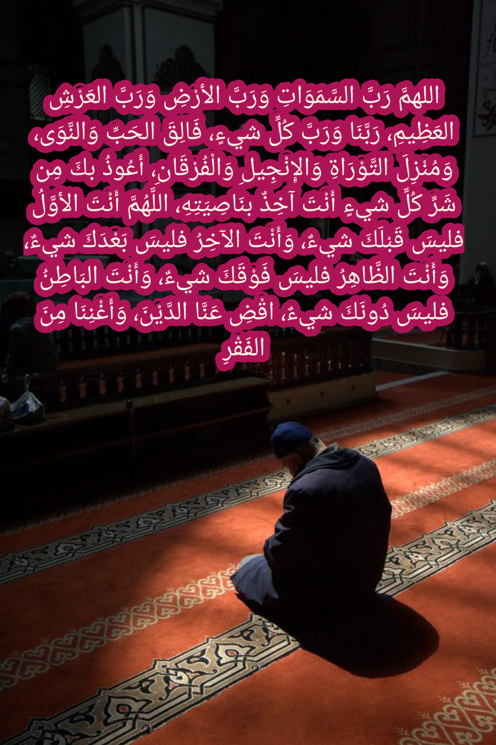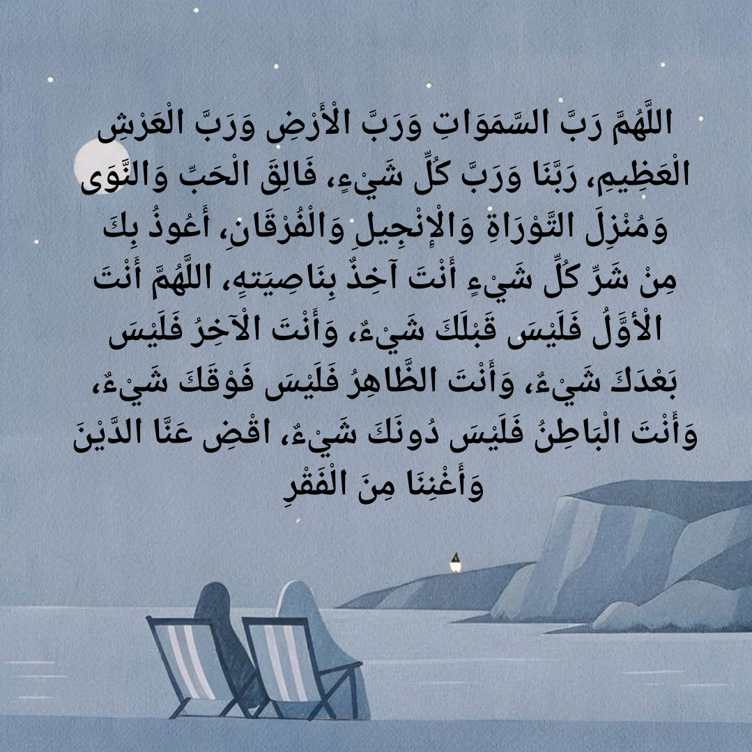 - يا حي يا قيوم برحمتك أستغيث أصلح لي كل شأني ولا تكلني لنفسي طرفة عين ،أنت القائل في كتابك الكريم ﴿ أَنِّي مَسَّنِيَ الضُّرُّ وَأَنتَ أَرْحَمُ الرَّاحِمِينَ ﴾ وأنا العبد الذي لا ملجأ له ولا منجى إلا إليك، أُردد في يقين ﴿ لَّا إِلَـٰهَ إِلَّا أَنتَ سُبْحَانَكَ إِنِّي كُنتُ مِنَ ٱلظَّـٰلِمِينَ ﴾، وحسبي الله ونعم الوكيل في كل أمري فلا ناصر لي إلا أنت يا ذا القوة والعظمة.