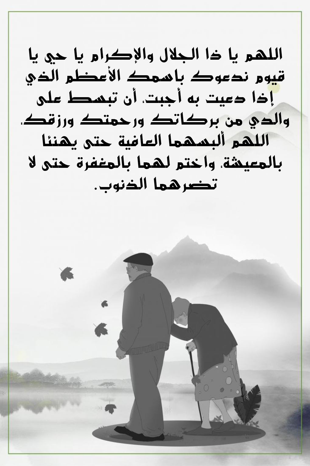 - اللهم ارحم والديَّ كما ربياني صغيرًا، وأسعد قلوبهم وازح عنهم كل ضيق وحزن، اللهم وسِّع لهم في أرزاقهم وبارك لهم في أعمارهم، اللهم امنح أبي وأمي الصحة والعافية واملأ حياتهم بالسكينة والطمأنينة.