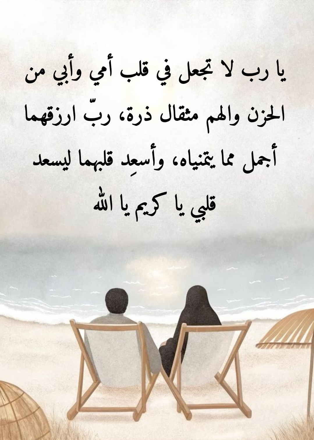 - اللهم أعطِ والدي من فضلك وكرمك ما يملأ قلوبهم فرحًا وسعادتهم راحةً ورضًا يارب أمي عانت في حملي وتحملت مشقة الولادة ولم تُغلق عيناها خوفًا علي وأبي كان الحماية التي لم أشعر معها يومًا بالخوف اللهم اغفر لهما وأسبغ عليهما من بركاتك وعوضهما عن كل ما بذلاه من جهد وتعب.