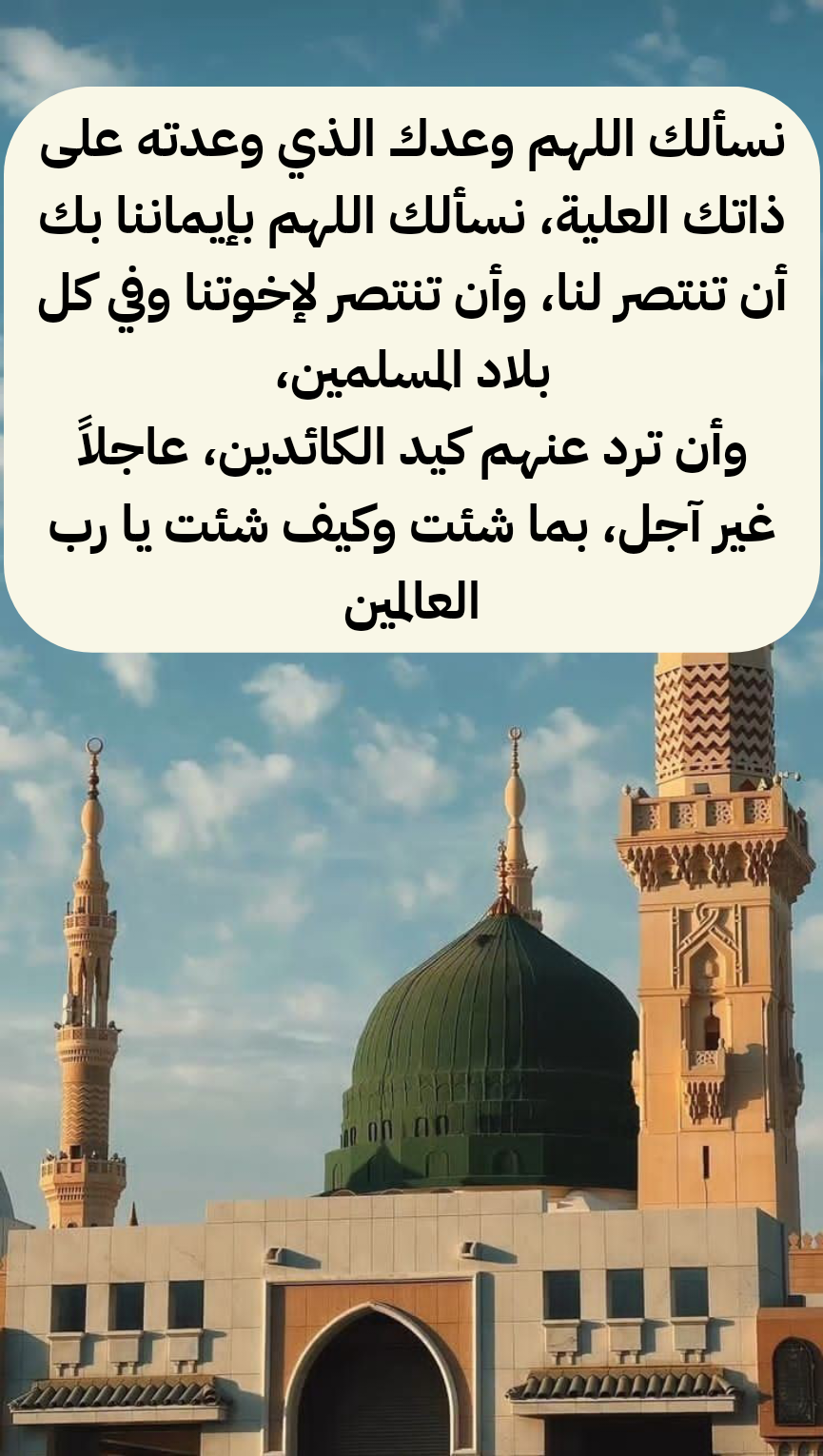 • اللّهمّ زدنا إيمانًا وثبتنا على الحق ووحد كلمتنا واجعلنا من عبادك الذين تنصرهم على أعدائك وأعداء الدين وتوفنا على الإسلام وأكرمنا برؤية وجهك الكريم يوم لقائك.