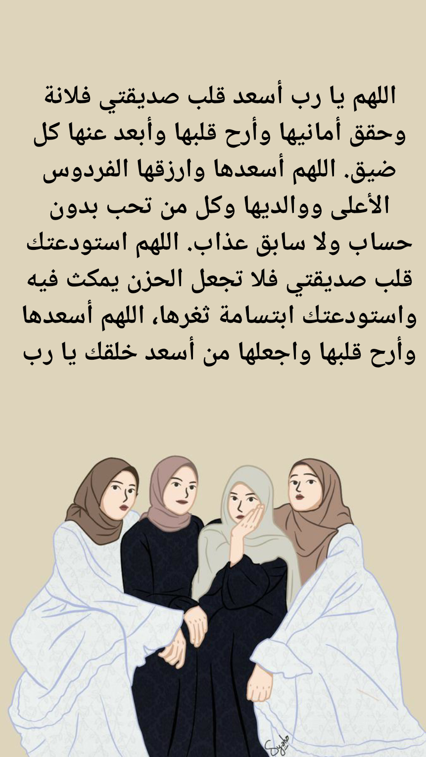 - اللهم فرِّج هم صديقتي الغالية واملأ قلبها بالراحة والسكينة، يا رحمن أبعد عنها شر الفتن واهدِها لقول الحق وفعل الصالحات، اللهم اجعلها قوية على أداء الطاعات وبارك لها في كل خطوة تخطوها، يا كريم اصرف عنها كل سوء وحفظها من البلاء ويسِّر لها طريق الخير واملأ حياتها بالطمأنينة والسرور يا أرحم الراحمين.
