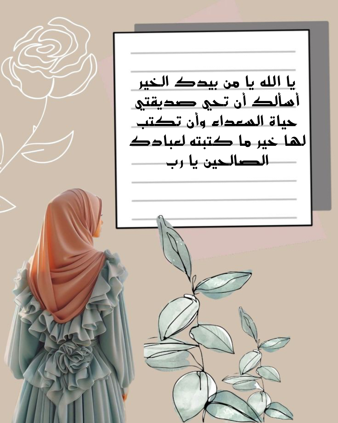 - اللهم يا واسع الرحمة ويا مجيب الدعاء، أسألك أن تهب صديقتي الهداية والنور في دربها، اللهم احفظها بحفظك الذي لا يُضام وأمدها بقوتك التي لا حدود لها، يا الله اجعل قلبها مطمئنًا بذكرك واغفر لها ذنوبها وزدها قربًا منك، يا رب فرّج همها وابعث في روحها السكينة واملأ حياتها فرحًا وسعادة، اللهم أكرمها بكل خير وارزقها من فضلك الواسع وحقق لها ما تصبو إليه نفسها في طاعتك.