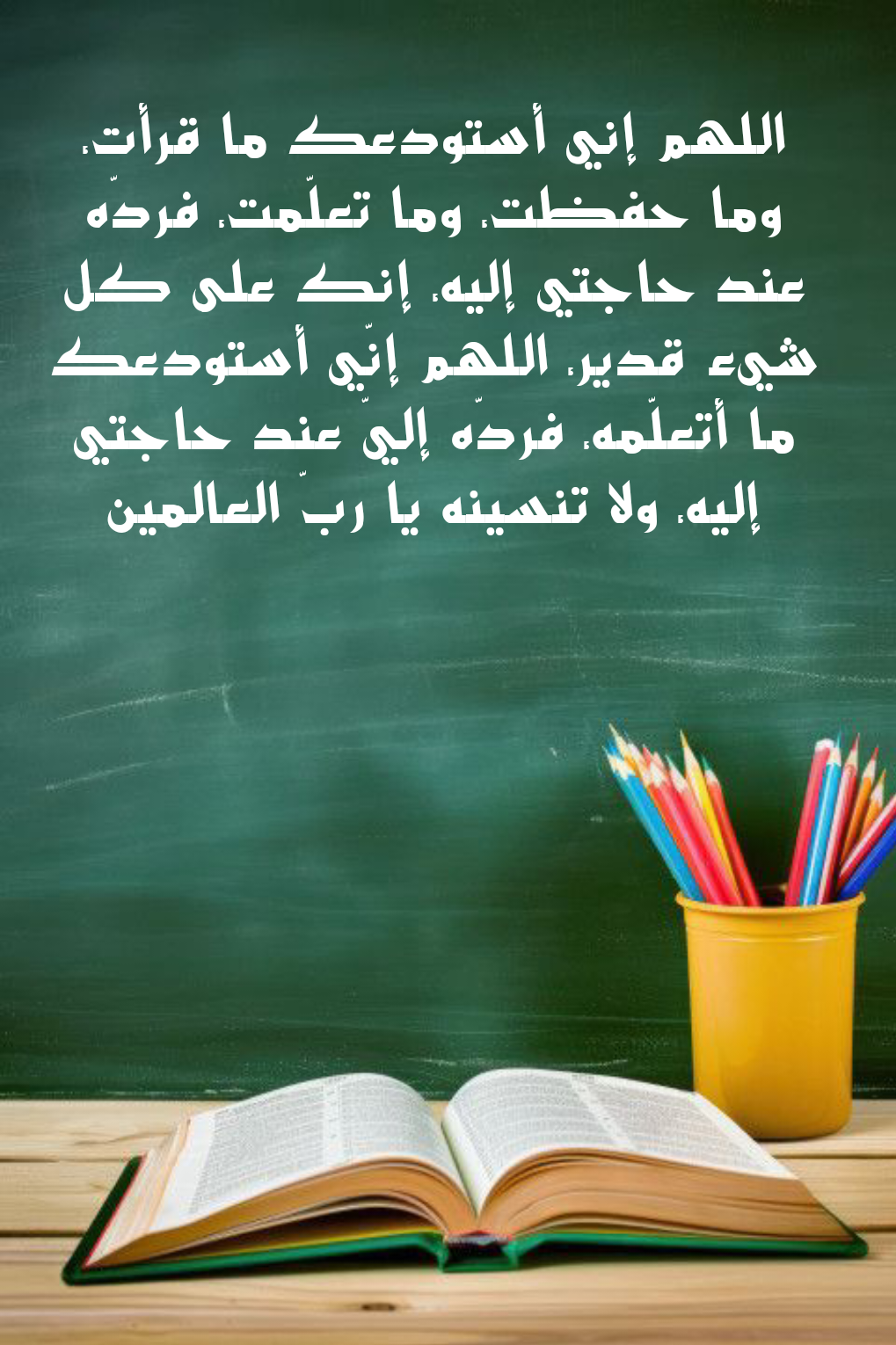 - اللَّهُمَّ إنِّي أستودِعُكَ كُلَّ ما قرأتُه وحفِظتُه وتعلَّمتُه، فردَّه إليّ حين أحتاجُه لأنَّك على كُلِّ شيءٍ قدير وحسبيَ اللَّهُ ونِعم الوكيل يا أرحم الراحمين.
