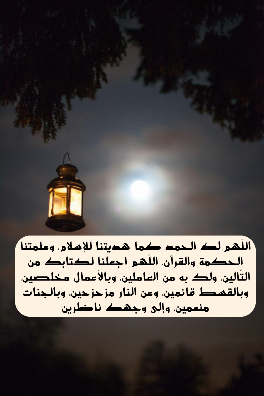 - يا ربنا يا من أوجدتنا ورزقتنا وأنت الحكم العدل فينا، نسألك يا الله بكل اسم هو لك علمته خلقك أو استأثرت به في علم الغيب عندك أن تجعل القرآن الكريم ربيع قلوبنا ونور صدورنا وجلاء أحزاننا وذهاب همومنا، وأن تهدينا به سبل الخير لنيل جنات النعيم.