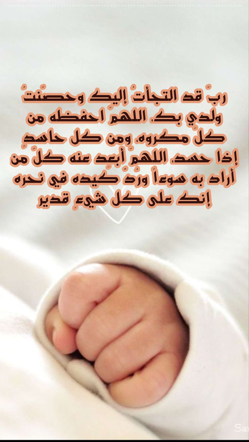 - اللَّهُمَّ يا مالك النفوس ويا مقسم الأرزاق أنت الذي وهبتني هذا الوليد برحمتك وأسألك أن تحفظ له حياته وأن تكون عونًا له في كل مساعيه اللَّهُمَّ اجعله في حفظك الذي لا يُحَد وفي رعيتك التي لا تُغفل اللَّهُمَّ يا سند الراجي ويا نور المُحتاج أعنه على مواجهة ضعفه وقوه برحمتك التي تُغني عن كل شيء يا واسع المَنن ويا دائم المعروف آمين.