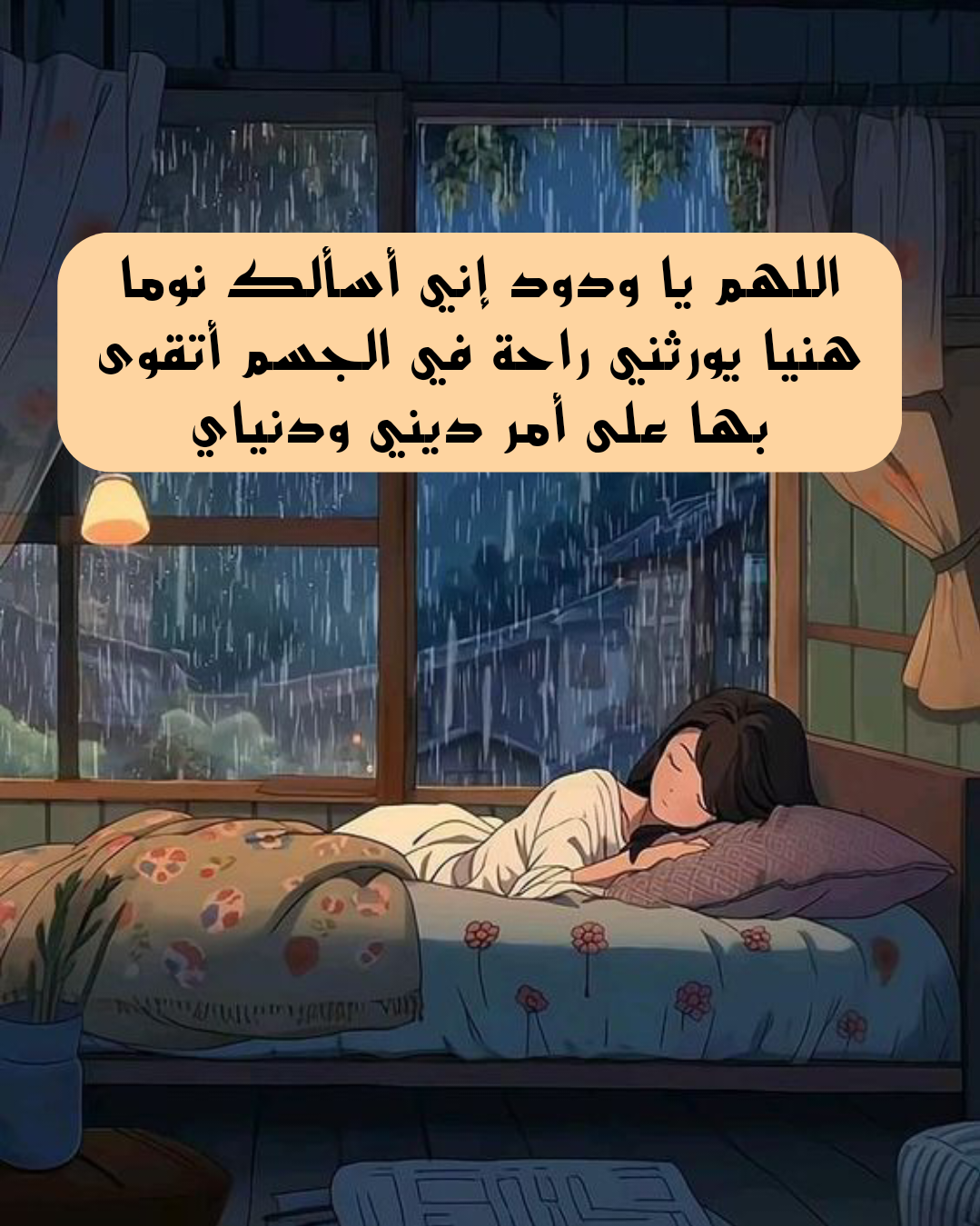 - اللهم ارزقني نومًا هنيئًا سعيدًا وأبعد عني الأحلام المزعجة ويسر لي الخير في الدنيا واجعلني من ورثة جنات النعيم في الآخرة.