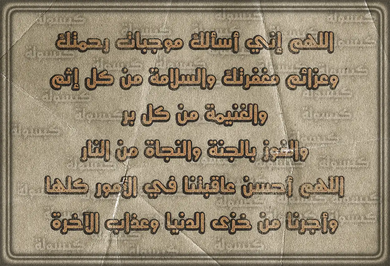 - “اللهم إني أسألك موجبات رحمتك وعزائم مغفرتك والسلامة من كل إثم والغنيمة من كل بر والفوز بالجنة والنجاة من النار، اللهم أحسن عاقبتنا في الأمور كلها وأجرنا من خزى الدنيا وعذاب الآخرة”.