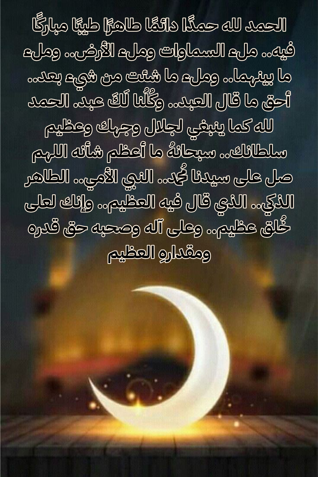 - اللهم لك الحمدُ حمدًا كثيرًا طيبًا مباركًا يملأُ السماواتِ والأرضَ وما بينَهما وما شئتَ من شيءٍ بعدُ أنتَ أهلُ الثناءِ والمجدِ ونحنُ عبادُك لا نحصي ثناءً عليكَ أنتَ كما أثنيتَ على نفسِك لك الحمدُ بما يليقُ بجلالِ وجهِك وعظيمِ سلطانِك سبحانَك ما أعظمَ شأنَك.