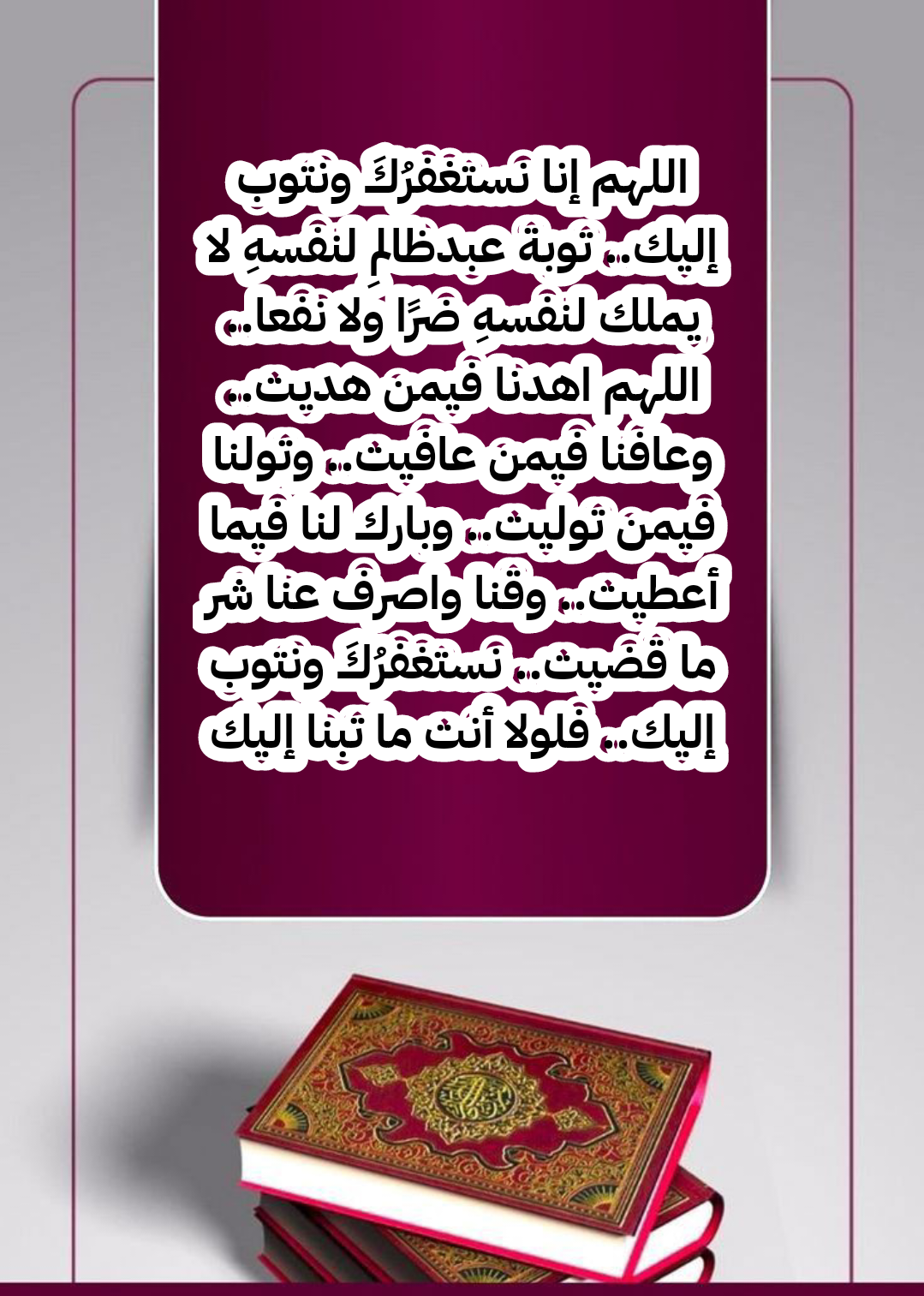 - اللهم اهْدِنا مع منْ هديتَ وعافِنا مع منْ عافيتَ وتَوَلَّنا مع منْ تَوَلَّيتَ وبارِكْ لنا فيما أعطيتَ واصرفْ عنَّا شرَّ ما قضيتَ نستغفرُك ونرجِعُ إليك لا ملجأَ لنا منك إلا إليك.