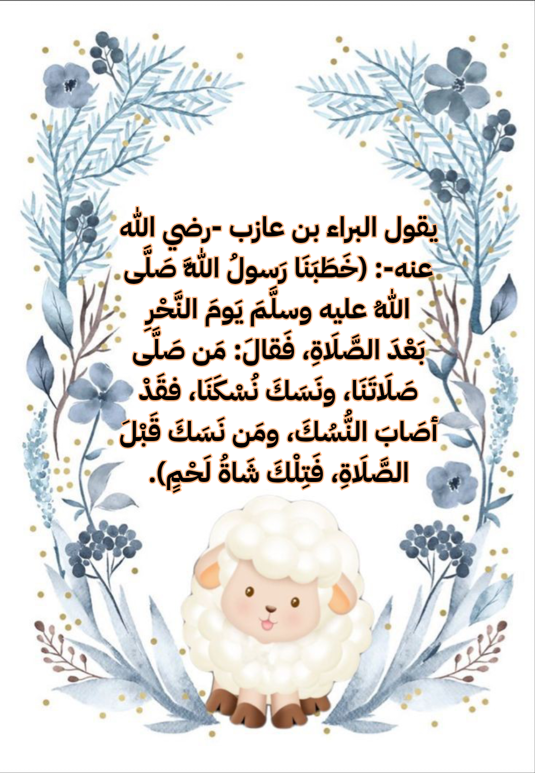 - جاء عن البراء بن عازب -رضي الله عنه- أن النبي -صلى الله عليه وسلم- قال: «من ذبح قبل الصلاة. فإنما هو لحم قدّمه لأهله، وليس من النسك في شيء».