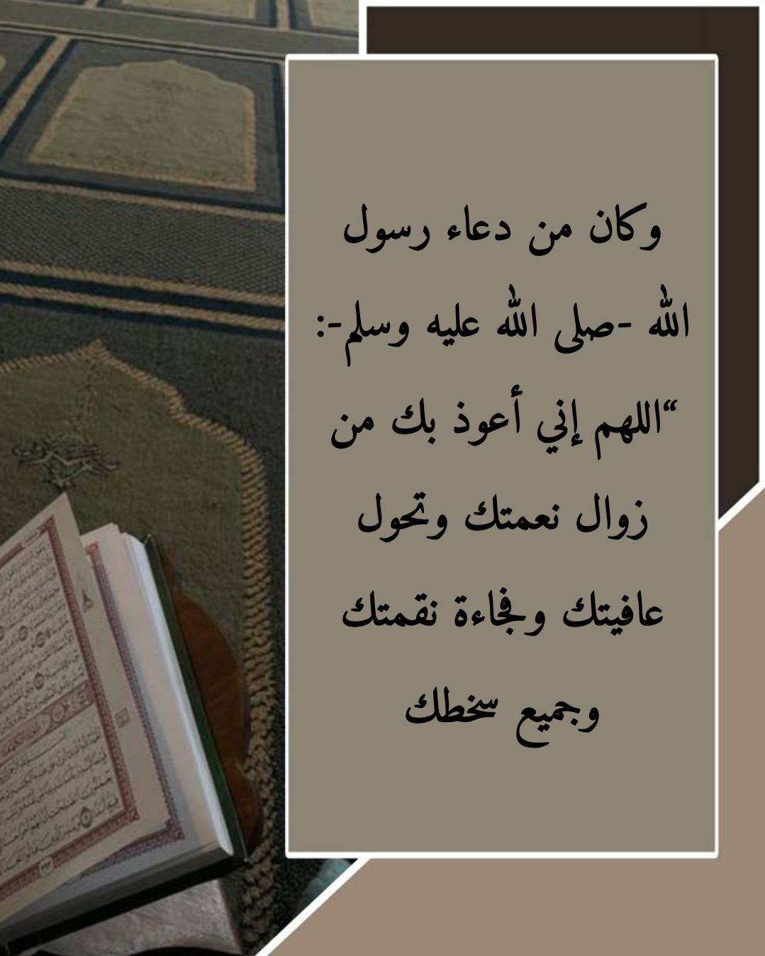 - اللَّهُمَّ إِنِّي أَعُوذُ بِكَ مِنَ زَوَالِ نِعْمَتِكَ وَتَحَوُّلِ عَافِيَتِكَ وَفُجَاءَةِ نِقْمَتِكَ وَجَمِيعِ سَخَطِكَ.