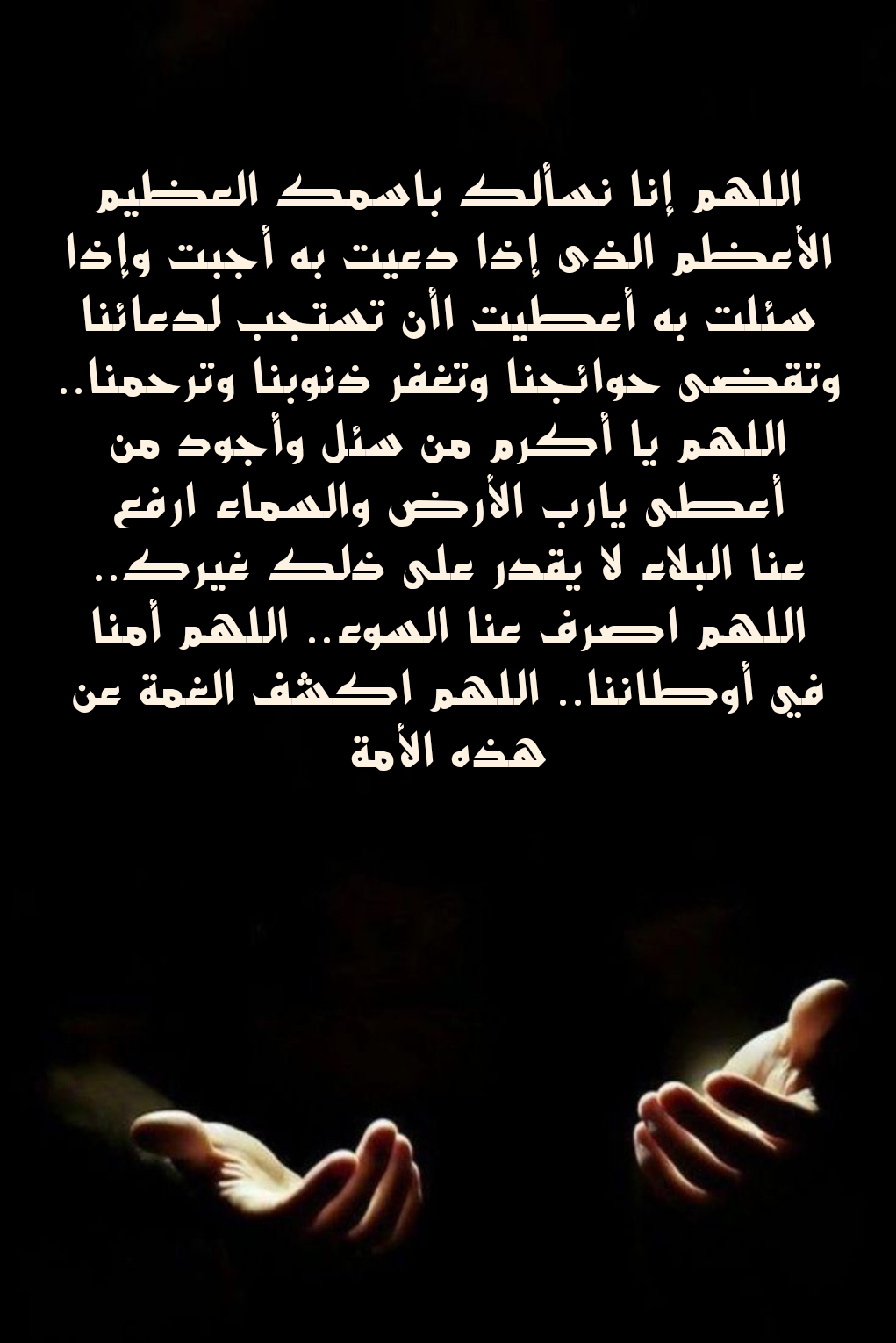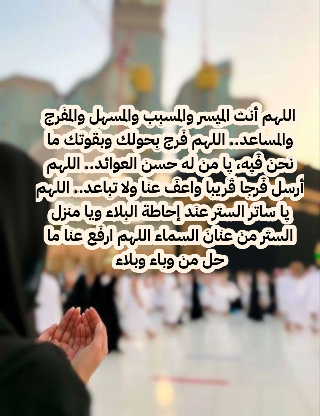 - اللهم ندعوك بأسمائك الحسنى كلها، وباسمك الأعظم الذي إذا دُعيت به أجبت، أن تكشف عنّا البلاء والمحنة وتدفع عنا ما نخشاه وما نحذر، ربنا إنّا لا نجد ملاذًا غيرك ولا رجاء لنا إلا بك، ففرّج عنا كل ضيق واكشف عنا كل ضرّ، وأجرنا من كل همّ، يا واسع الرحمة ويا قريب العطاء، نجّنا بقدرتك ولطفك فإنك سبحانك إذا أردت شيئًا فإنما تقول له كن فيكون.
