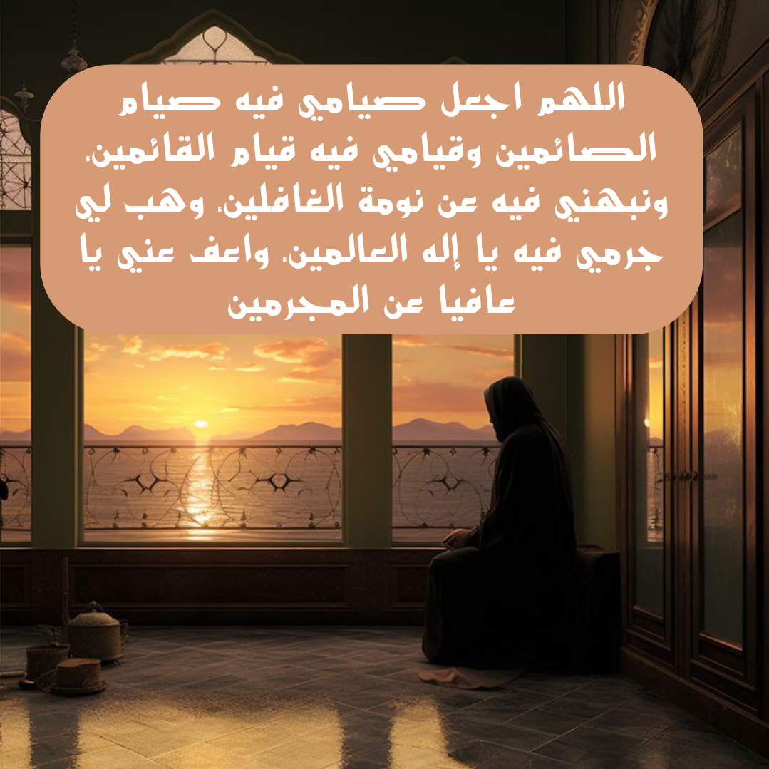 • اللَّهُمَّ اجْعَلْنَا مِمَّنْ يُعِينُهُمْ صِيَامُ شَهْرِ رَمَضَانَ عَلَى التَّرْكِ لِلذُّنُوبِ وَالأَحْزَانِ وَاجْعَلْنَا مِنَ الَّذِينَ يُحْيُونَ لَيَالِيهِ بِالْقِيَامِ طَمَعًا فِي مَغْفِرَتِكَ وَخَيْرِكَ وَارْزُقْنَا غَفْرَانَكَ وَطَمَأْنِينَتَكَ أَثْنَاءَ أَيَّامِهِ وَاجْعَلْنَا نَشْهَدُ خَيْرَاتِهَا بِإِذْنِكَ يَا ذَا الأَيْدِ وَالمَجْدِ.