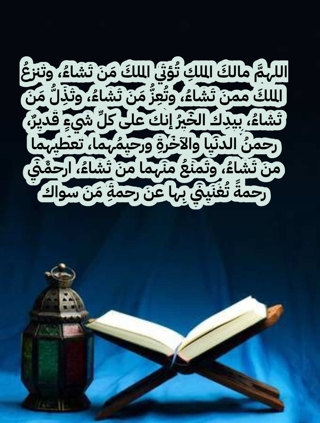 - اللهم يا من خلقت الإنسان وأنزلت القرآن وأنت عالم الغيب والشهادة، بارك لجميع المسلمين في صيامهم وقيامهم في شهر رمضان، وأعنّا فيه على الاجتهاد في الطاعة وقراءة كتابك العزيز، وابعد عنا همزات الشيطان، وامنحنا التوبة النصوح والمغفرة من الذنوب، وأكرمنا بفضلك وكرمك واجعلنا من عبادك الذين كتبت لهم الجنة برحمتك يا رحيم.