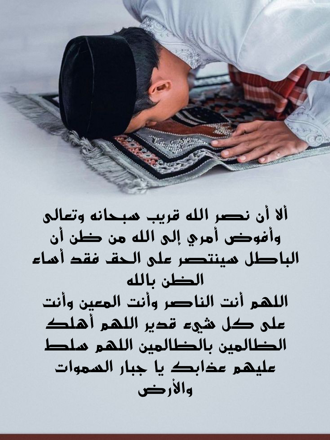 - يا الله يا جبار السموات والأرض يا قوي يا عزيز يا قادر على كل ما تريد أناديك بقلبي الموجوع وبروحي المثقلة بالظلم أسألك أن تكون بجانبي وترد لي حقي ممن اغتصبه بغير وجه حق أنت الحق وعدلك هو المرجو يا من لا يخيب عنده الرجاء.