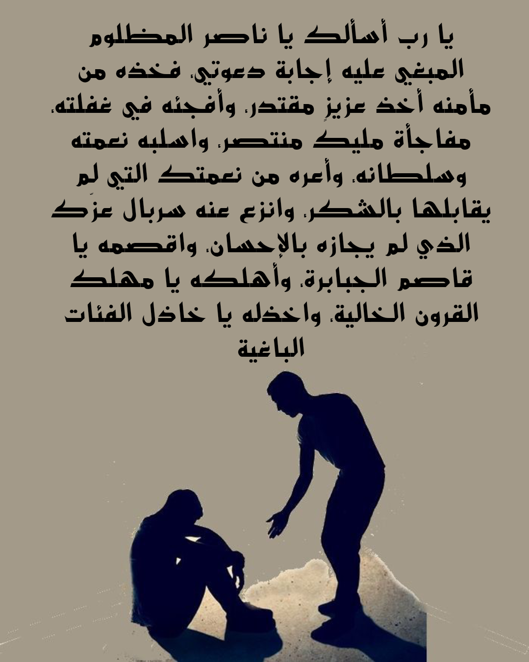 - يا الله يا من يسمع دعاء المضطرين إنّي أرفع يديّ متوسلًا إليك أن تُعينني على من ظلمني وبغى على حقي يا عادل يا كريم اجعل من أفسد عليّ حياتي واغتصب حقوقي يُذوق الكأس التي أذاقني إياها وحرمه من الراحة والسكينة كما سلبنيها وأنزل عليه بقدرتك عدلك الذي يبدد ظُلْمه ويعيد الحقوق إلى أهلها فأنت وحدك عون المظلومين لا يضيع لديك أجر الصابرين ولا حاجة أعظم من أن تنصرني يا رب العالمين من فوق سبع سماوات.
