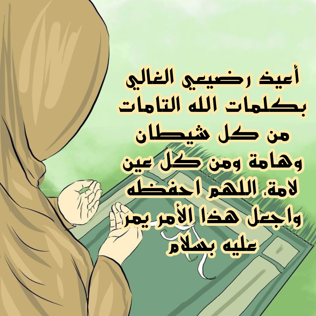 - بسم الله الذي لا يضره شيء في الأرض ولا السماء أعوذ بكلماتك الكاملة وأرقي طفلي من كل سوء يا لطيف برفق أبعد عنه كل أذى وهب له من عندك السكينة والرضا.