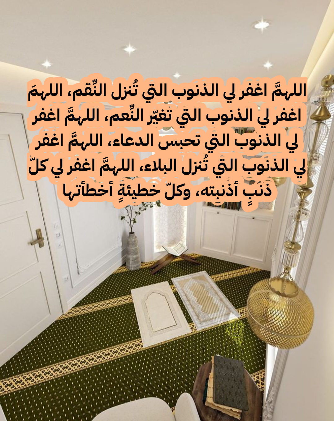 - ربّنا آتنا في الدنيا حسنة وفي الآخرة حسنة وقِنا عذاب النّار ربّنا لا تُزِغ قلوبَنا بعد إذ هديتنا وهَبْ لنا من لَدُنك رحمةً إنّك أنت الوهاب اللّهم اغفر لي ذنبي كلّه دقيقَه وجليلَه أوّلَه وآخرَه علانيتَه وسرّه.