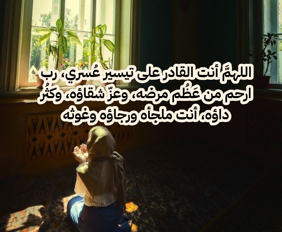 - اللهم إني أسألك برحمتك الواسعة، وبكرمك الذي لا حد له أن تلبسني ثوب العافية، لا أجد ملجأً إلا رحمتك ولا سندًا إلا عونك فأنت على كل شيء قدير، لك الحمد يا الله لا إله إلا أنت وحدك لك الحمد وأنت على كل شيء قدير، سبحانك لا إله إلا أنت سبحانك وبحمدك ولا حول ولا قوة إلا بك، يا من تجيب دعوة الداعي إذا ناداك، يا من تقدر على كل شيء أسألك شفاءً لا يُغادر سقماً وعافية تامة دائمة، ألبسني لباس الصحة والعافية برحمتك وكرمك يا أكرم الأكرمين يا رب العالمين.