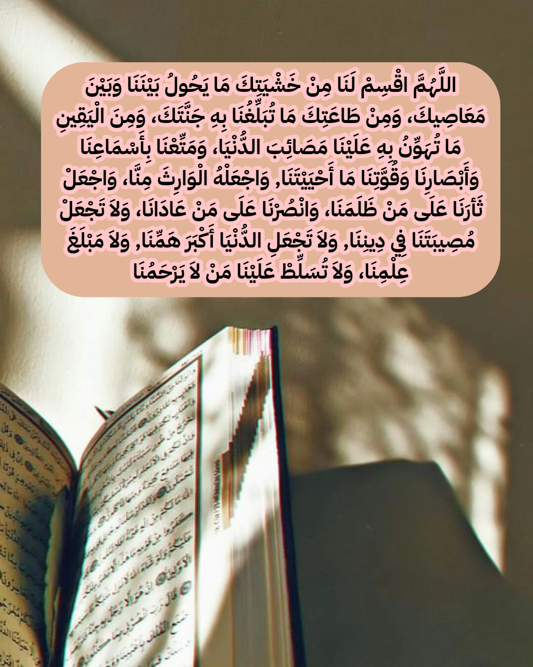 - اللهم ارزقنا من خشيتك ما يكون حاجزًا بيننا وبين معاصيك، ومن طاعتك ما يُبلغنا جنتك، ومن اليقين ما يُهوّن علينا مصائب الدنيا ومتّعنا بأسماعنا وأبصارنا.