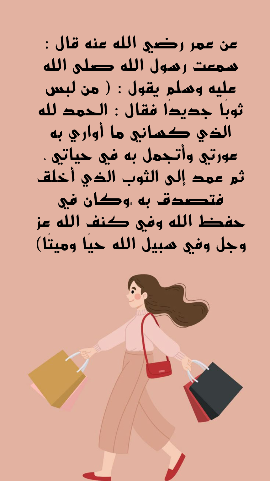 - عن عمر بن الخطاب رضي الله عنه قال: سمعت رسول الله ﷺ يقول: «من لبس ثوباً جديداً فقال: الحمد لله الذي كساني هذا الثوب ورزقنيه من غير حول مني ولا قوة ثم أخذ الثوب الذي تقادم استخدامه أو لم يعد بحاجة إليه وتصدق به حفظه الله عز وجل ورعاه ووفّر له من خيره وجعل ذلك العمل في سبيله سواء كان حيًا أو توفاه الله ويحدث ذلك مرتين».
