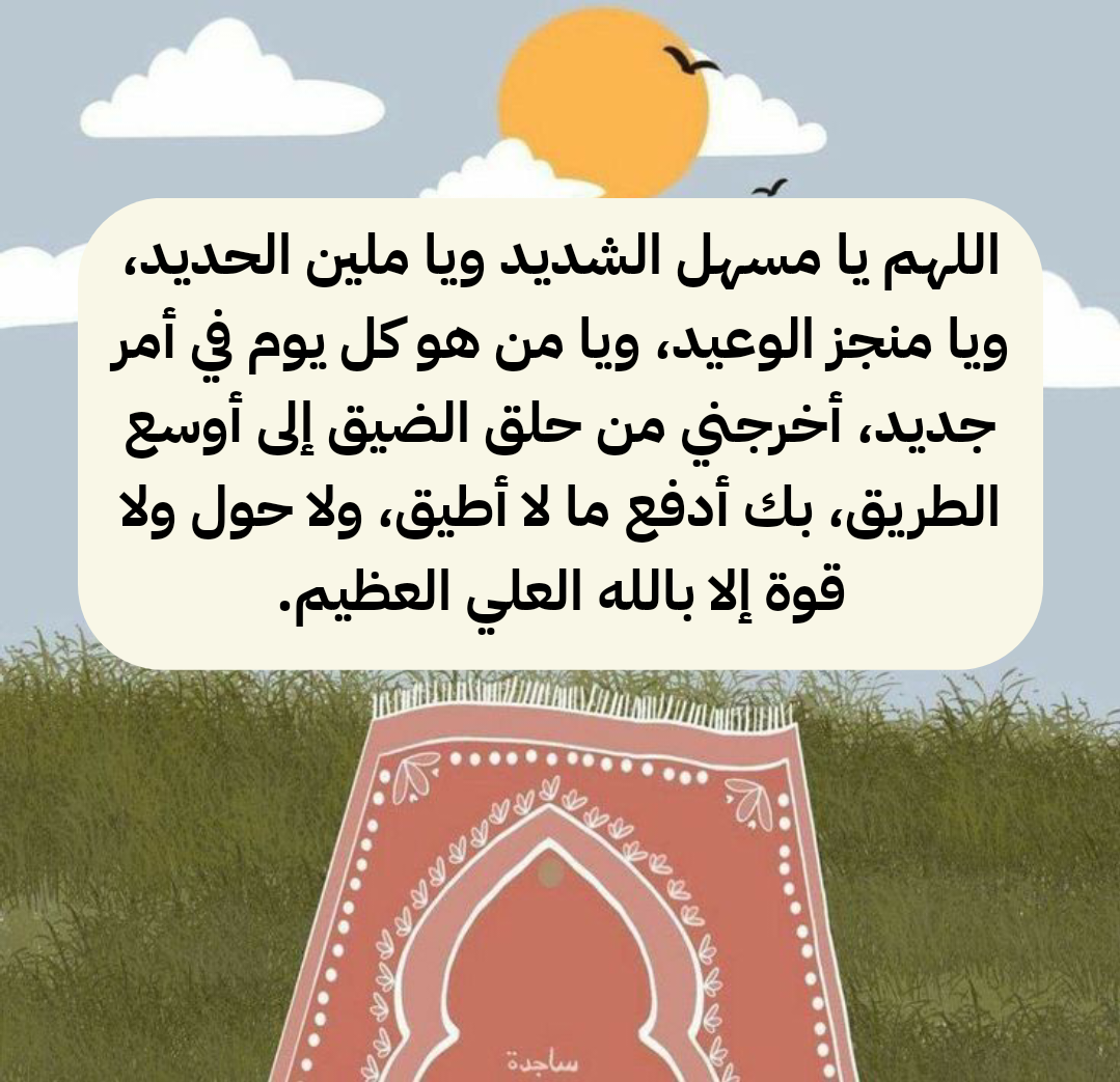 - اللَّهُمَّ يسِّر لَنا كُلَّ عَسِير وَبارِك لَنَا فِي أعمارِنَا وَأوقاتِنَا وَأرشدْنَا إِلَى الطَّريق الَّذِي يُرضِيك اللَّهُم اجعل سعَادَتنَا فِي قُلوبنَا بِهُدَاك وَثبتنَا علَى دِينك وَطاعَتك.