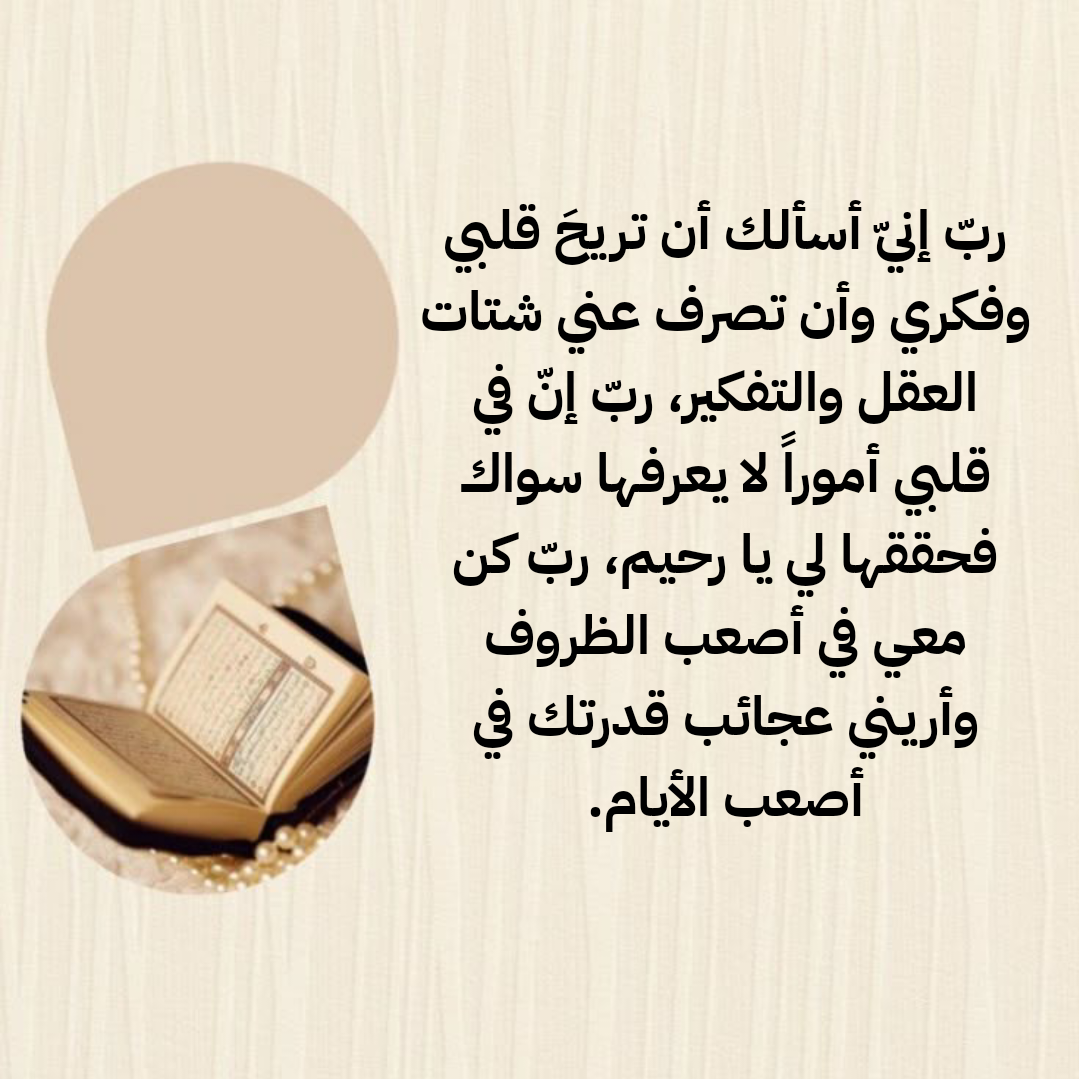 - اللهم أزل عنّا الهم وأبعد عن قلوبنا الحزن ونجّنا من البخل والشُّح ونسألك العافية من كل سوء استعاذ منه نبيك محمد صلى الله عليه وسلم اللهم أغمر أرواحنا بالسكون واملأ قلوبنا بموجات الطمأنينة.