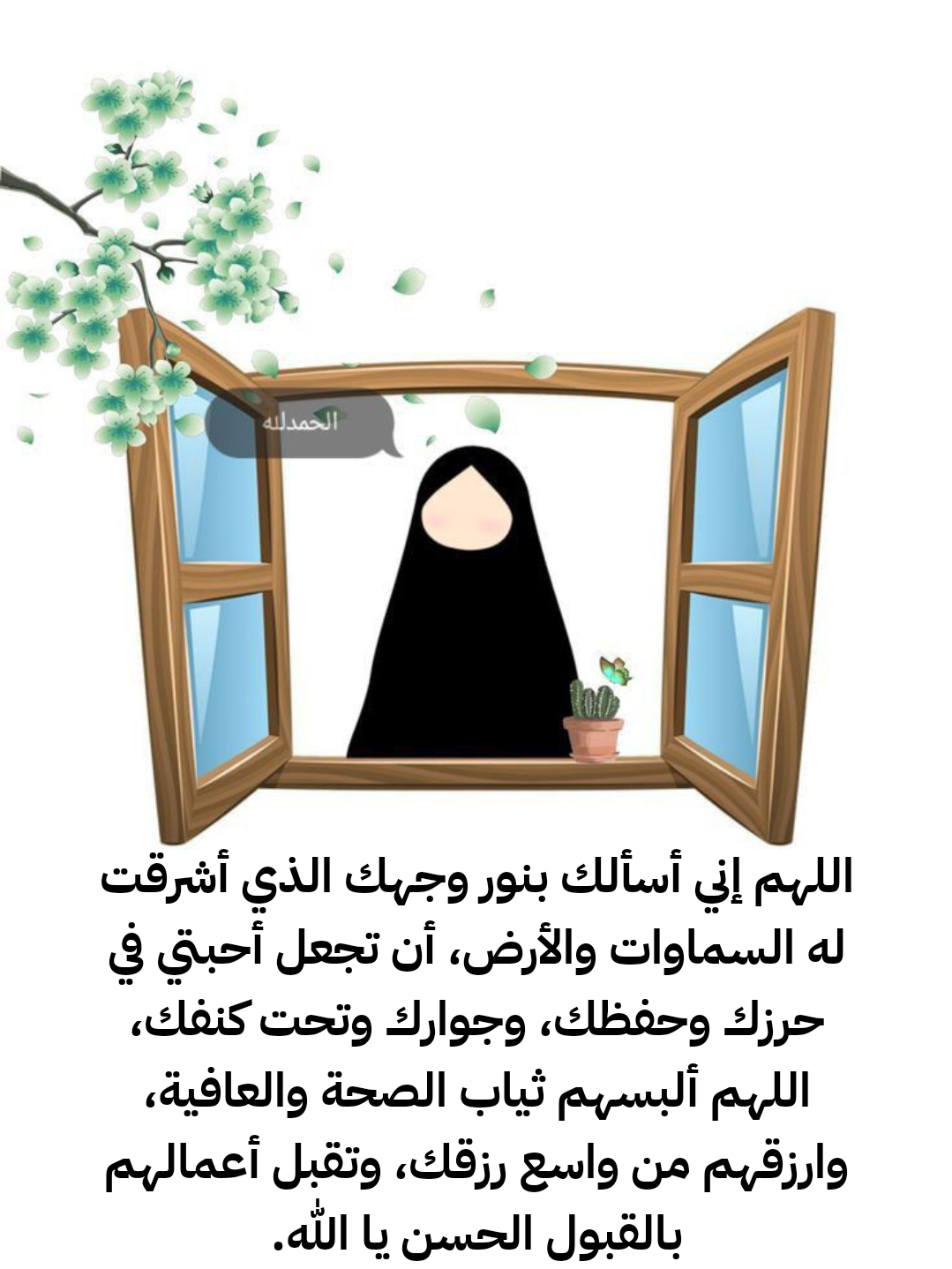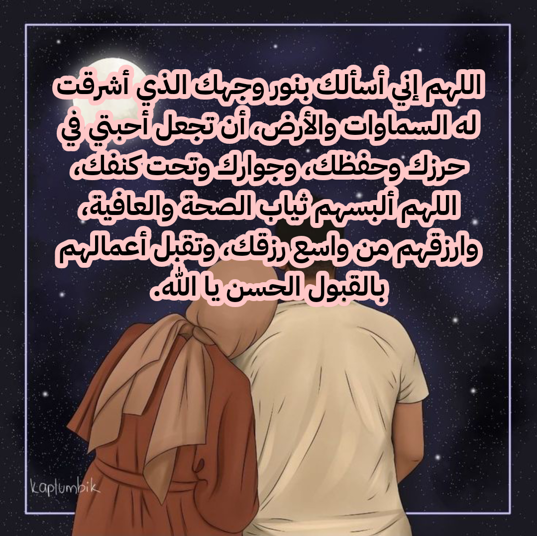 • نسألك يا الله بعزتك وجلالك أن تجمعنا نحن ومن نحب على الخير وفي خير حال اللهم اغفر ذنوبهم وزدهم من فضلك وكن لهم وليًا ونصيرًا اللهم ارزقهم طاعتك واملأ قلوبهم بحبك اللهم اجعلهم من عبادك الصالحين.