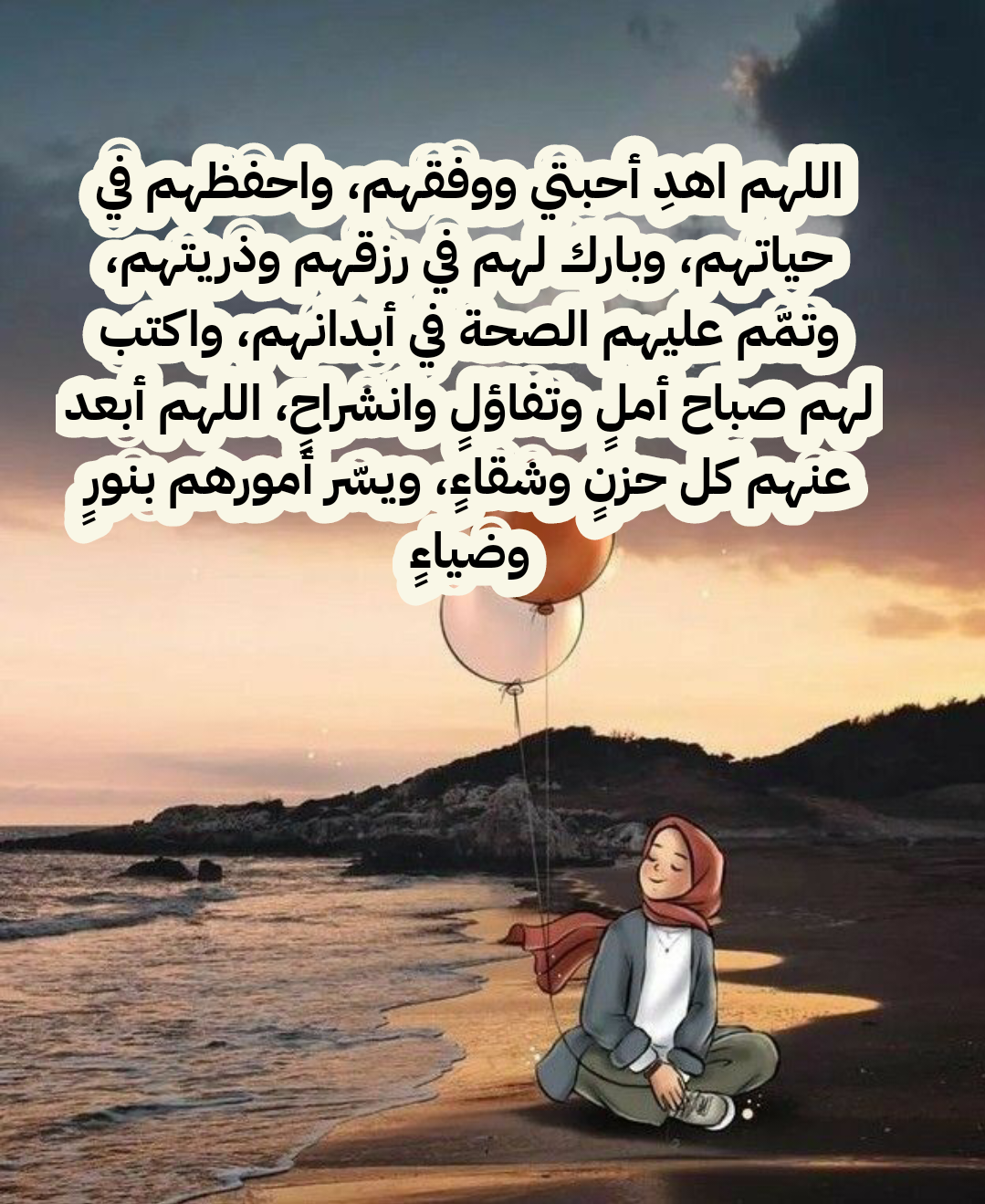 • اللهم بكرمك ولطفك، نسألك أن تغمر من نحبهم بالرضا والمغفرة وأن تُفيض على قلوبهم بهجة لا تنقطع وأن تسوق لهم أسباب النجاح والتيسير وتجعل كل خطوة في حياتهم مليئة بالخير والبركة.