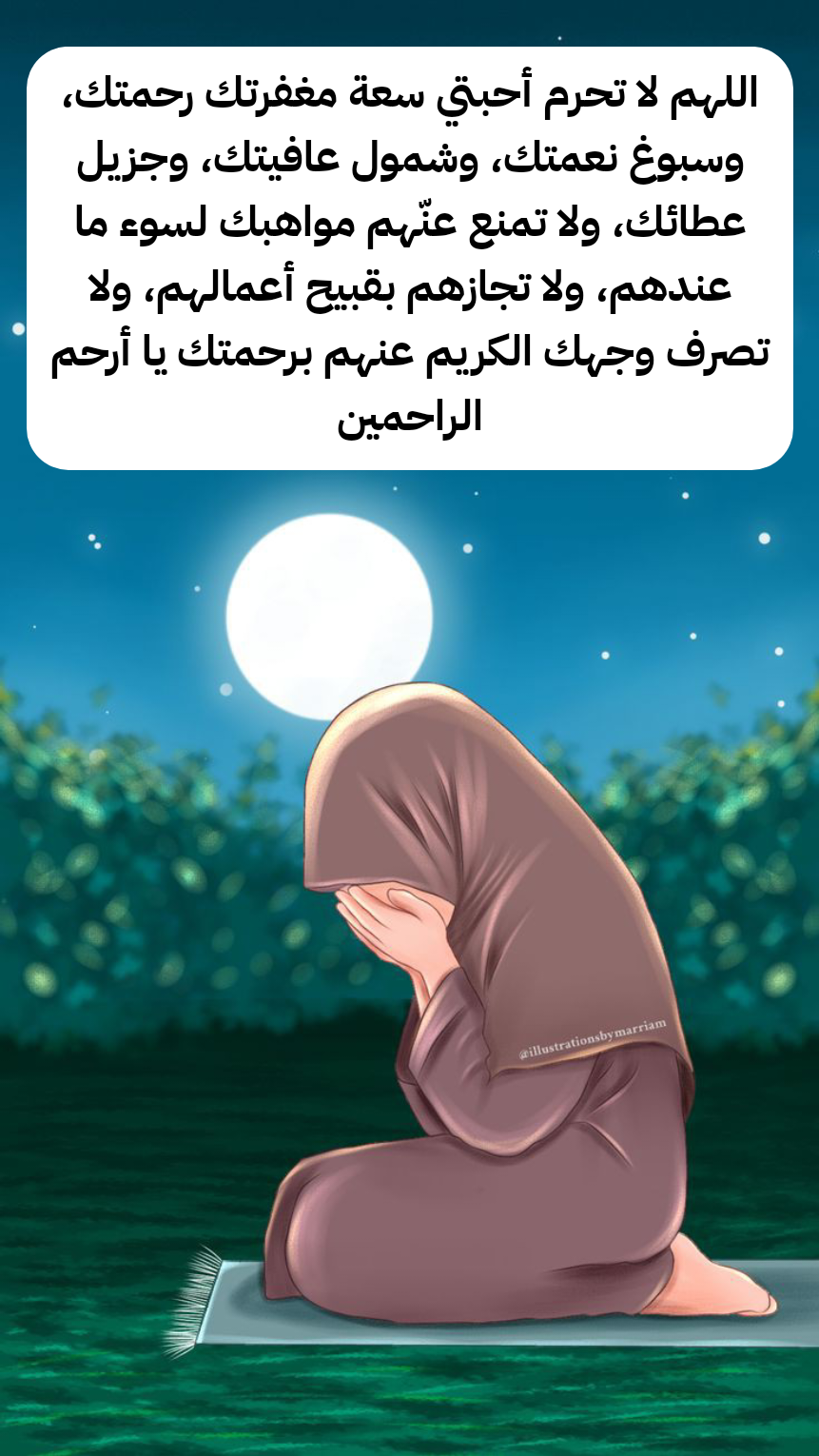 - يا كريم يا واسع الرحمة، أنظر إلى قلب صديقتي، إن كان فيه هم فأزل ثقله عنها، وإن كان فيه حزن فاجبر كسرها، وإن كان فيه مرض فامنحها الشفاء، فأنت أحنّ عليها من أي أحد وأنت القادر على كل شيء.