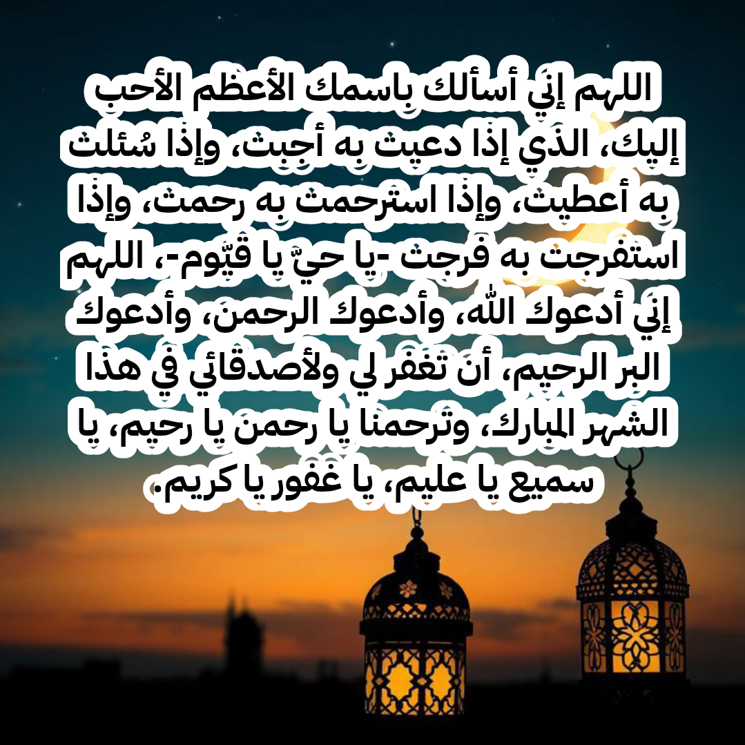 - اللهم إن لي أختًا لم تلدها أمي أسألك أن تحفظها بعينك التي لا تنام، وأن تكتب لها النجاح في كل مجالات حياتها وتيسر لها الخير في الدنيا والآخرة، اللهم لا تريني فيها بأسًا يؤلمها، وامنحها من رحمتك ما يُزيل عنها كل هم وحزن اللهم ارزقها رزقًا واسعًا واغمرها بفيض كرمك، وأكرمها بالأجر العظيم في هذا الشهر المبارك.