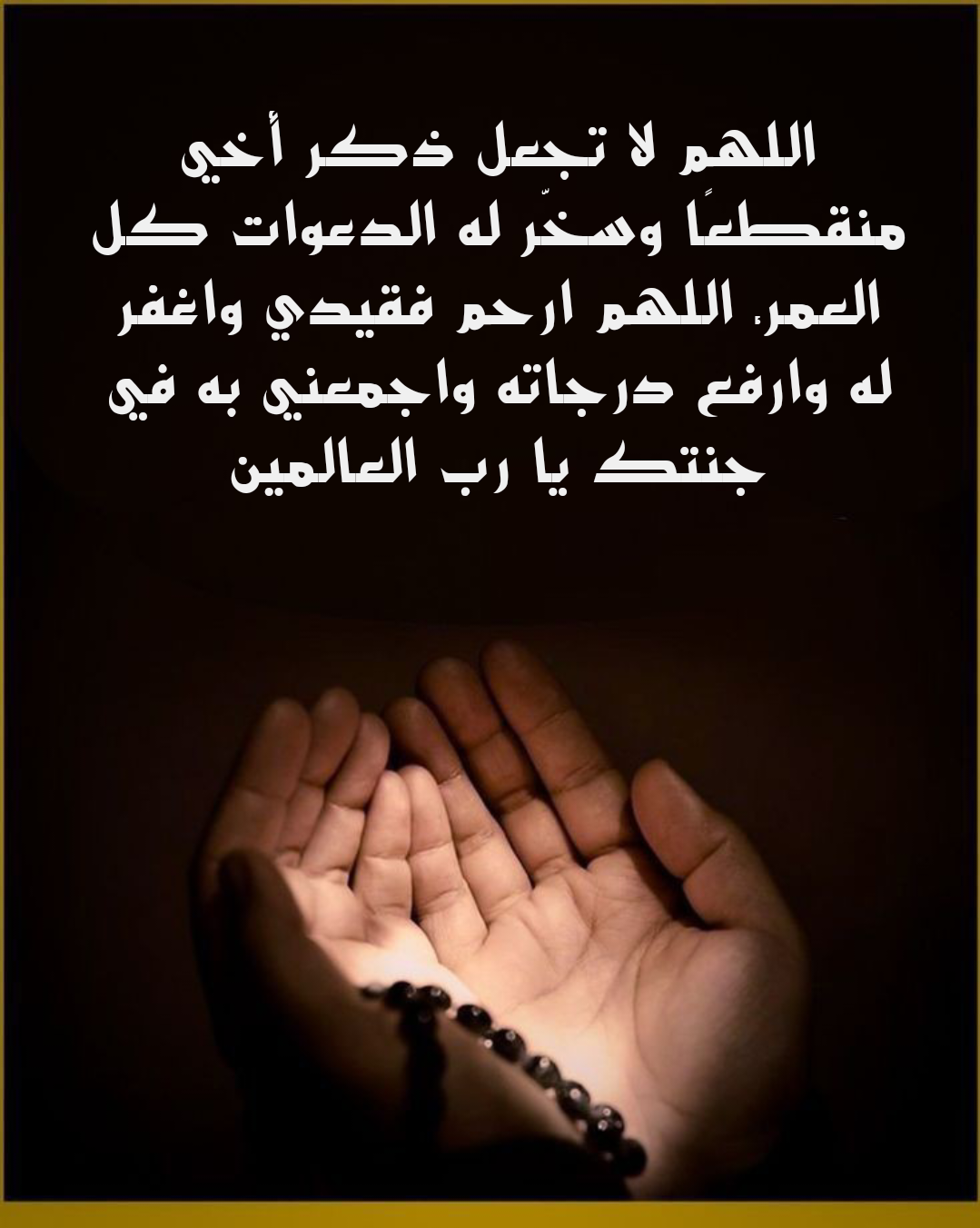 - اللهم اجعل أخي ممن يستبشرون بجنان الخلود واجعله يا رب من أهل النعيم الدائم واغفر له بعظيم مغفرتك وكرمك يا غفور يا رحيم اجعل أخي حبيبي وقرة عيني قريبًا دائمًا من رحمتك التي هو بأمس الحاجة إليها يا رب طهره من الذنوب وكفر عنه السيئات واغسله بالماء والثلج والبرد وأعطه نصيبًا وافرًا من دعاء المسلمين.