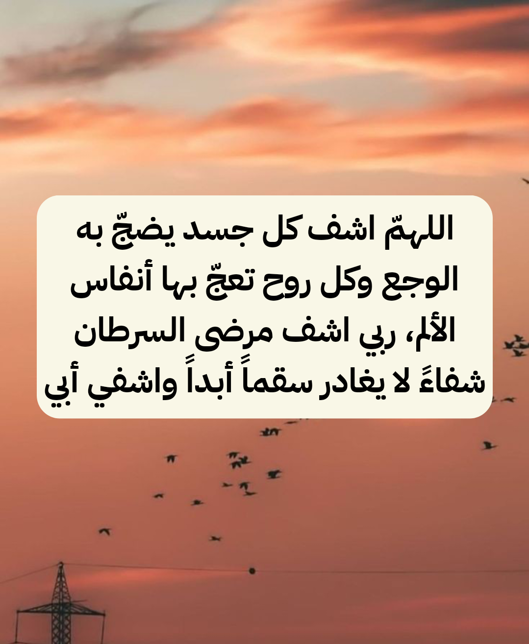 - اللهم اشفِ مرضانا ومرضى المسلمين بشفاء لا سقم بعده، اللهم امسح بيمينك الشافية على كل مبتلى وارفع عنه المرض وهب له الصحة والعافية، اللهم تولَّ أمره بعنايتك واجعل العافية لباسه والشفاء نصيبه، اللهم احرسه بعينك التي لا تنام وأحطه بحفظك الذي لا يُضام، اللهم اجعل له في كل لحظة شفاء وفي كل لحظة راحة وسكينة برحمتك يا أرحم الراحمين.