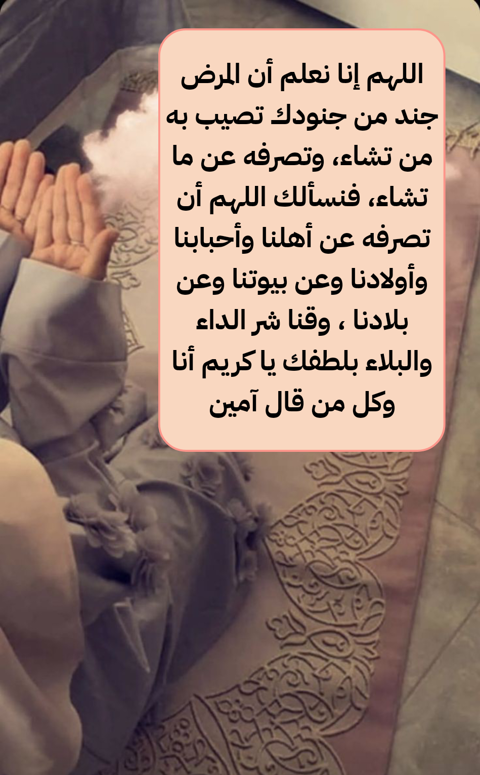 - يا الله اكشف الضر عن كل مبتلى ورد العافية لكل من أرهقه الألم اللهم ارزقنا صحة بلا سقم وعافية تدوم علينا برحمتك وقدرتك التي وسعت كل شيء.