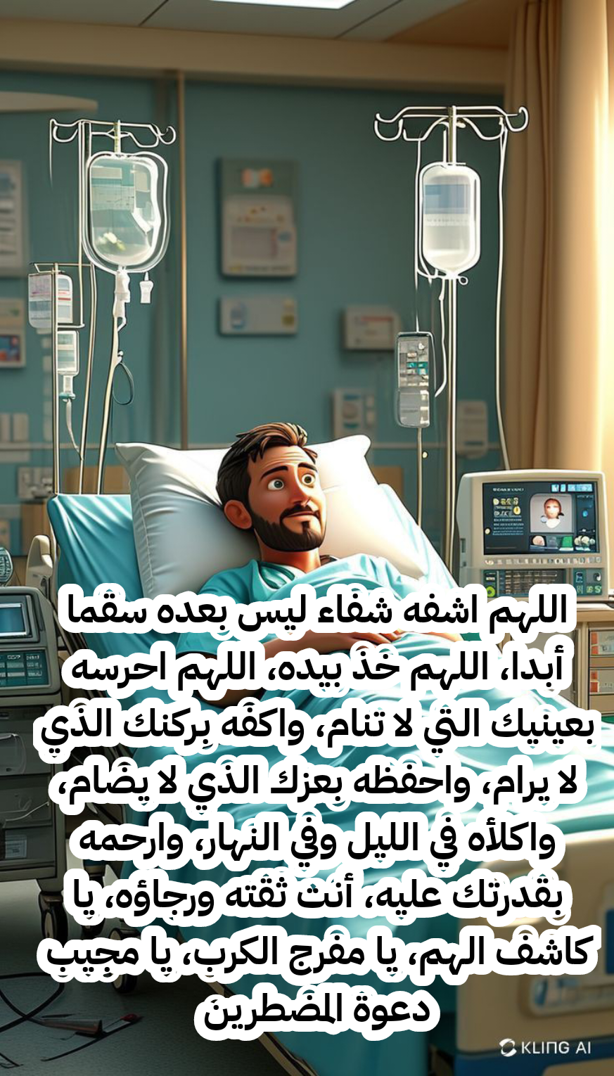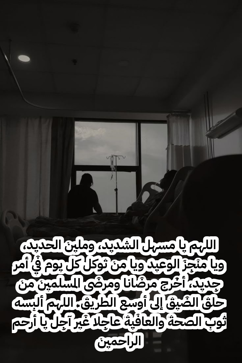 - يا الله، اشفه وألبسه ثوب الصحة والعافية، يا من لا تأخذه سنة ولا نوم كن معه ولا تكن عليه اللهم أحط جسده بلطفك وعنايتك واجعل له في رحمتك فرجاً وأزل عنه الألم والوجع وأكرِمه براحة لا يغادرها السقم.