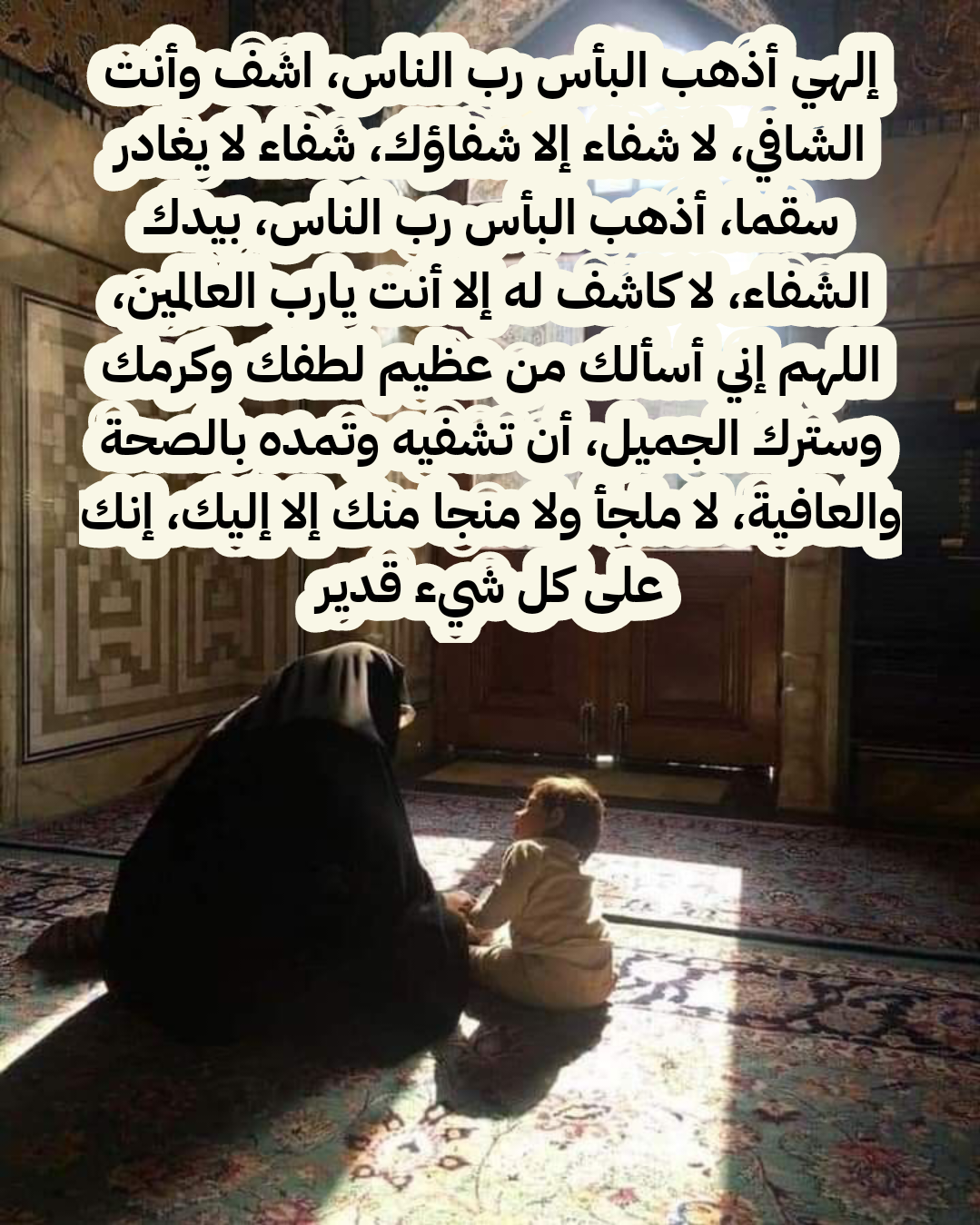 - اللهم باسمك الأعظم الذي إذا دُعيتَ به أجبت وبأسمائك الحسنى وصفاتك العُلى، وبرحمتك التي وسِعت كل شيء نسألك أن تَمُنّ عليه بشفاءٍ لا يُغادر سقَمًا، وأن تُزيل عنه كل ألم وداء.