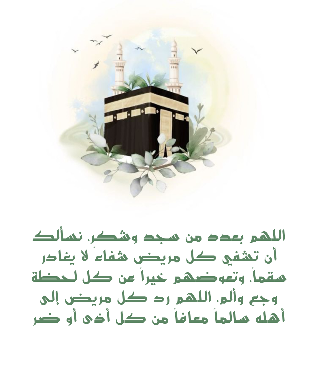 • يا الله في هذا اليوم الفضيل يوم عرفة نسألك بكل أسمائك الحسنى أن تشفي جميع مرضى المسلمين، وأن تمنحهم شفاءً لا يغادر سقمًا وأن ترفع البلاء عن كل بيت فيه معاناة المرض، اللهم انشر السكينة والطمأنينة في قلوبهم وارزقهم فرحة لا تزول وارحم برحمتك الواسعة من غادرونا واجعل منازلهم في أعالي جنات النعيم.