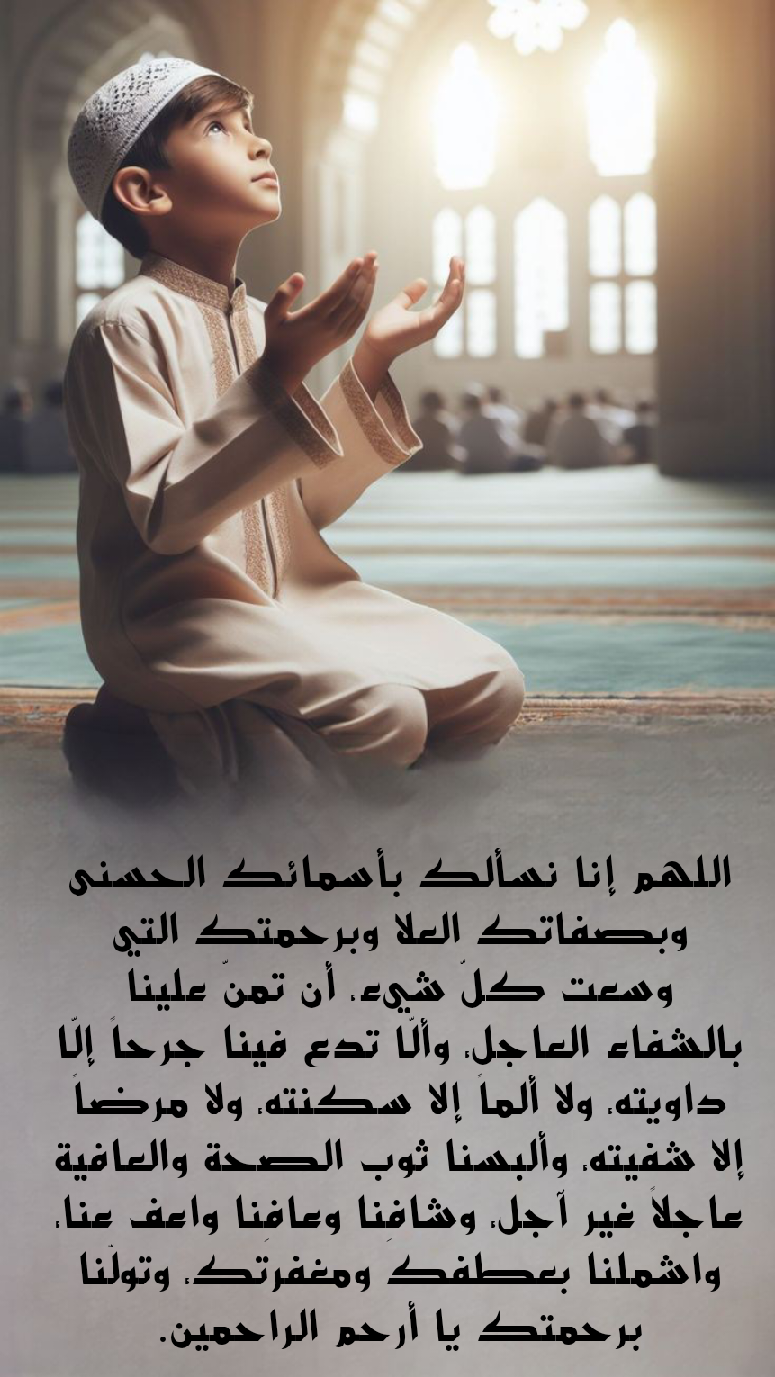 - اللهم إنا نسألك بأسمائك الحسنى وصفاتك العلا وبرحمتك التي وسعت كلّ شيء أن تمنّ علينا بالشفاء العاجل وألّا تدع فينا جرحاً إلّا داويته ولا ألماً إلا سكنته ولا مرضاً إلا شفيته وألبسنا ثوب الصحة والعافية عاجلاً غير آجلاً وشافِنا وعافِنا واعف عنها واشملها بعطفك ومغفرتك وتولّنا برحمتك يا أرحم الراحمين.