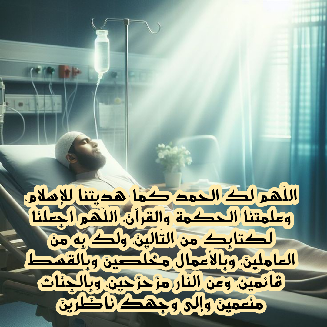 - اللهم يا سامع دعوة من لجأ إليك ويا من بيدك مفاتيح الشفاء لكل مبتلى، ندعوك أن تلبس كل مريض ثوب الصحة والعافية وأن ترفع عنه البلاء والمحن، اللهم شفاءً يملأ قلوبهم أملاً ويمحو عن أجسادهم كل وهن فلا يبقى فيهم ألم ولا يذكرهم بمرض يا أرحم الراحمين يا رب العالمين آمين.