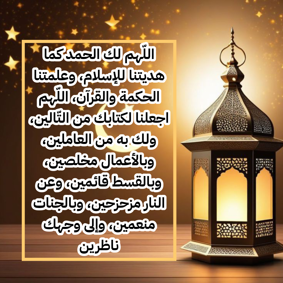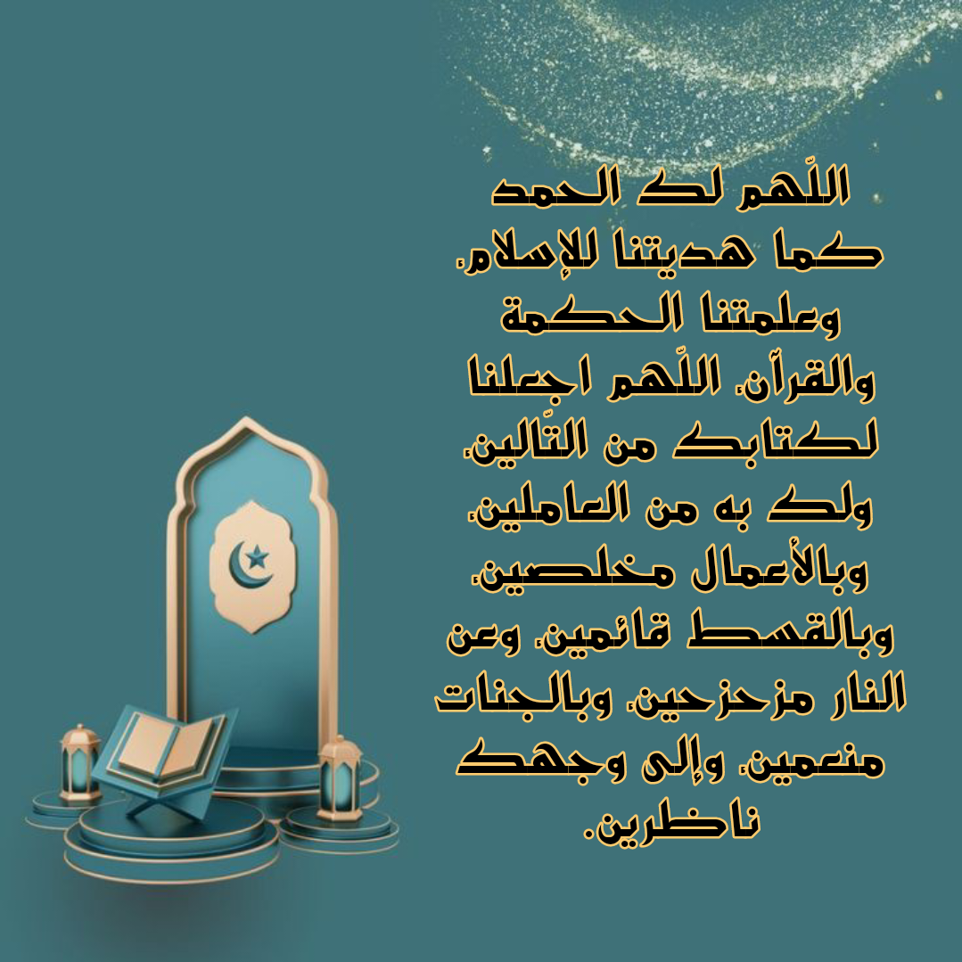 - اللهم اجعل القرآن العظيم نورًا لقلوبنا وضياءً لصدورنا واهدنا إلى صراطك المستقيم ووفقنا لما تحبه وترضاه واغفر لنا ولوالدينا وأدخلنا جنتك برحمتك يا أرحم الراحمين.