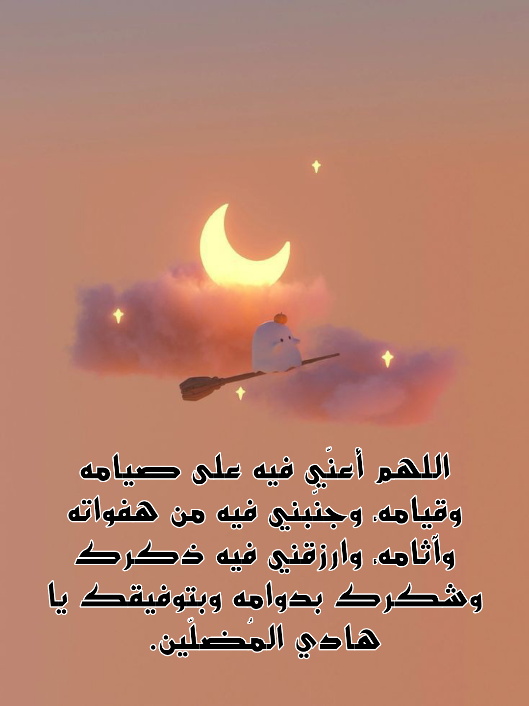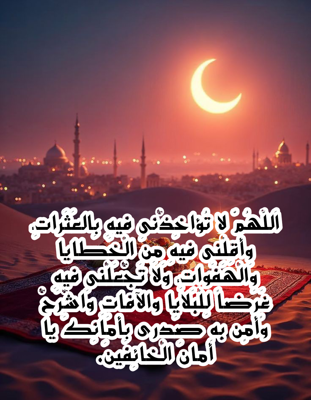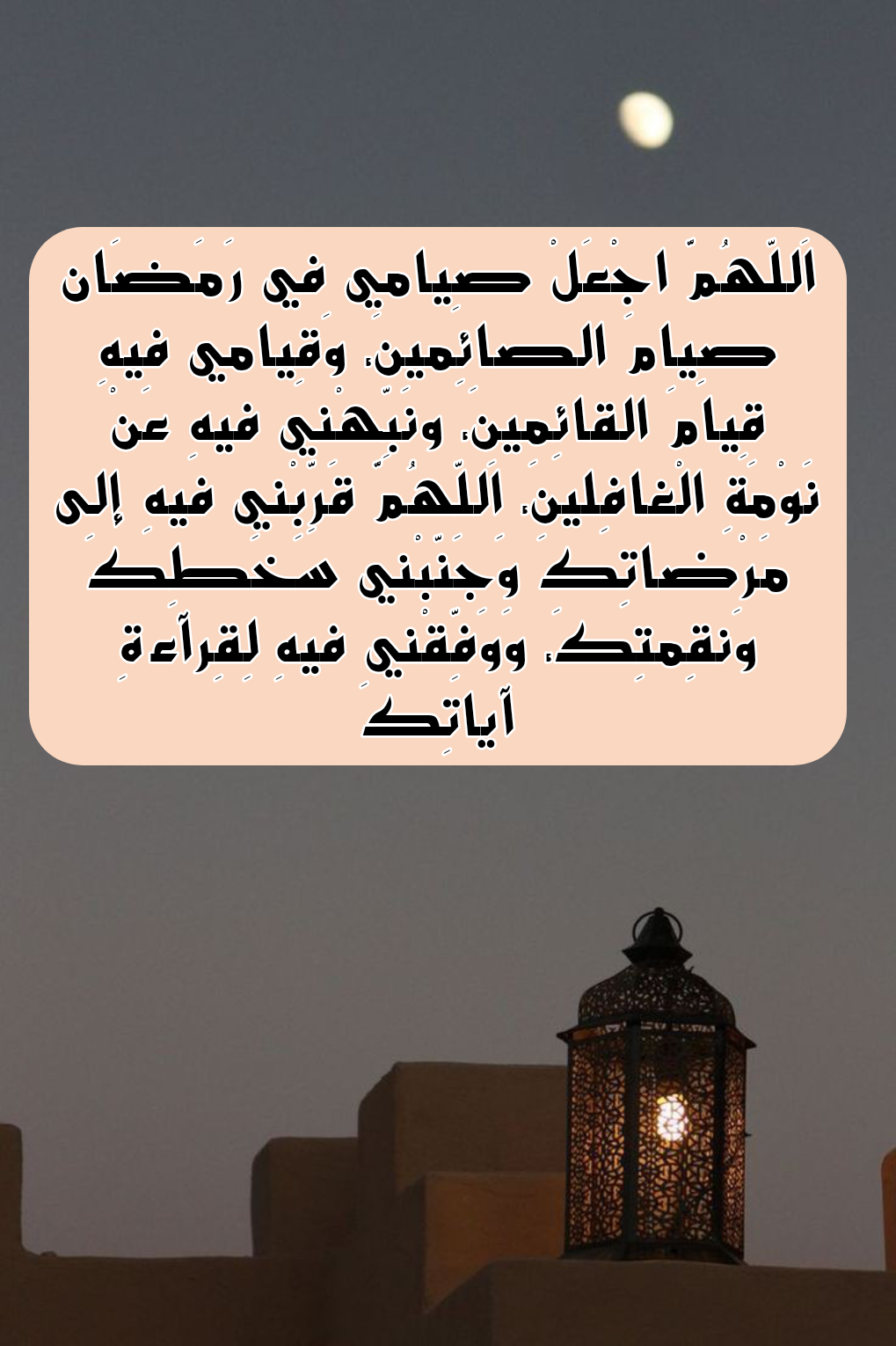 - اللهم اجعل صيامي خالصًا لك كما أمرت وقيامي نورًا يضيء دربي اللهم اجعلني من عبادك الصالحين ووفقني فيه لطاعتك كما تحب وترضى اللهم ارزقني القرب منك واهدني إلى سبيل مرضاتك وابعدني عن كل ما يغضبك ووفقني في تلاوة كتابك على الوجه الذي ترضاه.