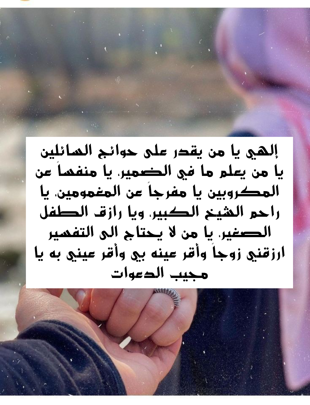 - يا الله يا دليل الحائرين وملجأ الطالبين يا من تفرج الكروب وتحقق الأحلام، اللهم امنحني زوجًا صالحًا تقر به عيني وأقر به عينه يا أكرم الأكرمين اجعل بيننا المودة والرحمة كما أمرتنا في كتابك وارزقنا الحلال واغننا بحلالك عن حرامك يا رب أنت تعلم حاجاتي وما يخفى عني فارزقني ما أتوق إليه قلبًا وقالبًا، وحقّق لي أمنياتي بما تُحب وترضى.