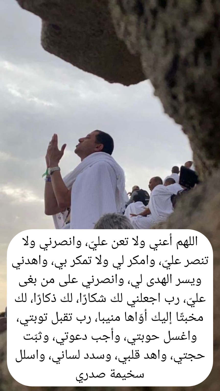 - اللهم لم يتبق إلا ساعات قليلة تفصلنا عن يوم عرفة نسألك يا الله أن تغسل ذنوبنا التي بيننا وبينك، ونسألك أن تسهل علينا أمورنا وتزيل عنا جميع العوائق التي تقف في طريقنا وتبعد عنا كل ما يؤذينا، احفظ لنا من نحب وزِدْ في إيماننا وامنح قلوبنا الطمأنينة برحمتك يا من رحمته وسعت كل شيء أرحمنا برحمتك التي لا حد لها.