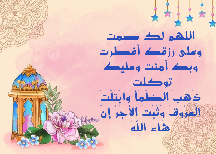 - اللهم لك صمت وعلى رزقك أفطرت وبك آمنت وعليك توكلت وإليك أنبت ذهب الظمأ وابتلت العروق وثبت الأجر إن شاء الله.