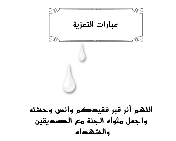 - إنا لله وإنا إليه راجعون عظّم الله أجركم وجبر مصيبتكم كما ورد عن النبي صلى الله عليه وسلم: “إنّما الصبر عند الصدمة الأولى” وأدعو الله أن يرزق فقيدكم سعة الرحمة وأن يجعل قبره روضة من رياض الجنة ويُدخله مدخلاً مباركًا مع الشهداء والصالحين في أعلى المنازل في الفردوس الأعلى، وأن يثبّت جوابه عند السؤال ويسكب عليكم بركة الصبر والإيمان وأن يعينكم على تجاوز الألم والمحنة برحمته الواسعة وعظيم فضله وقدره وكرمه.