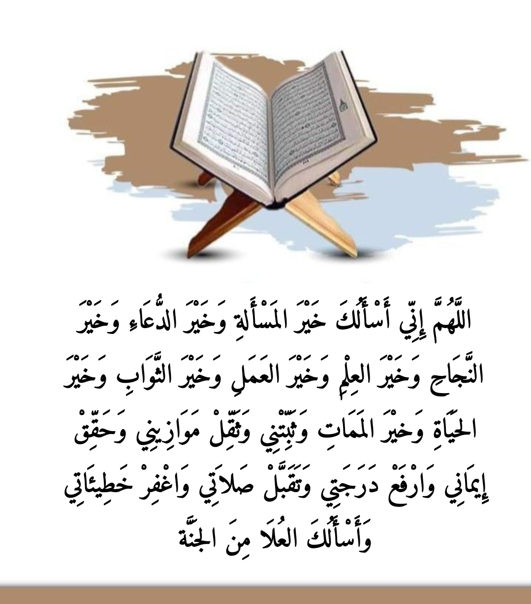 - اللهم اجعلنا ممن يتدبرون آيات كتابك وينتفعون بهديك ومن الفائزين عند ختمه نسألك يا الله بكل اسم سميت به نفسك أو أنزلته في كتابك أو علمته أحدًا من خلقك أو استأثرت به في علم الغيب عندك أن تجعل القرآن الكريم نورًا لقلوبنا وسكينةً لنفوسنا وربيعًا لصدورنا وذهابًا لهمومنا وغمومنا ودليلًا لنا إلى جنات النعيم برحمتك يا أرحم الراحمين.