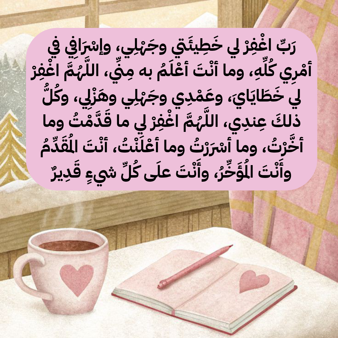 - اللهم اغفر لي خطاياي وأعنّي على القرب منك يا رب حبب إليّ عبادتك وأبعد عني وساوس الشيطان اللهم يسّر لي كل أمر فيه خير وابعد عني المشقة والتعب اللهم ارزقني تحقيق أمنياتي وزدني من نعمائك وفضلك.