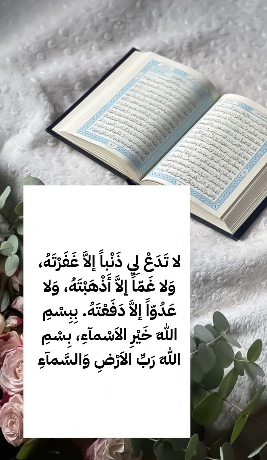 - أستغفر الله العظيم من كل ذنب اقترفته وأستغفره عن كل معصية ارتكبتها، اللهم طهّر قلبي من الذنوب، وابعد عني وساوس الشيطان وأصحاب السوء، واجعلني من عبادك الصالحين المغفور لهم يوم الدين.
