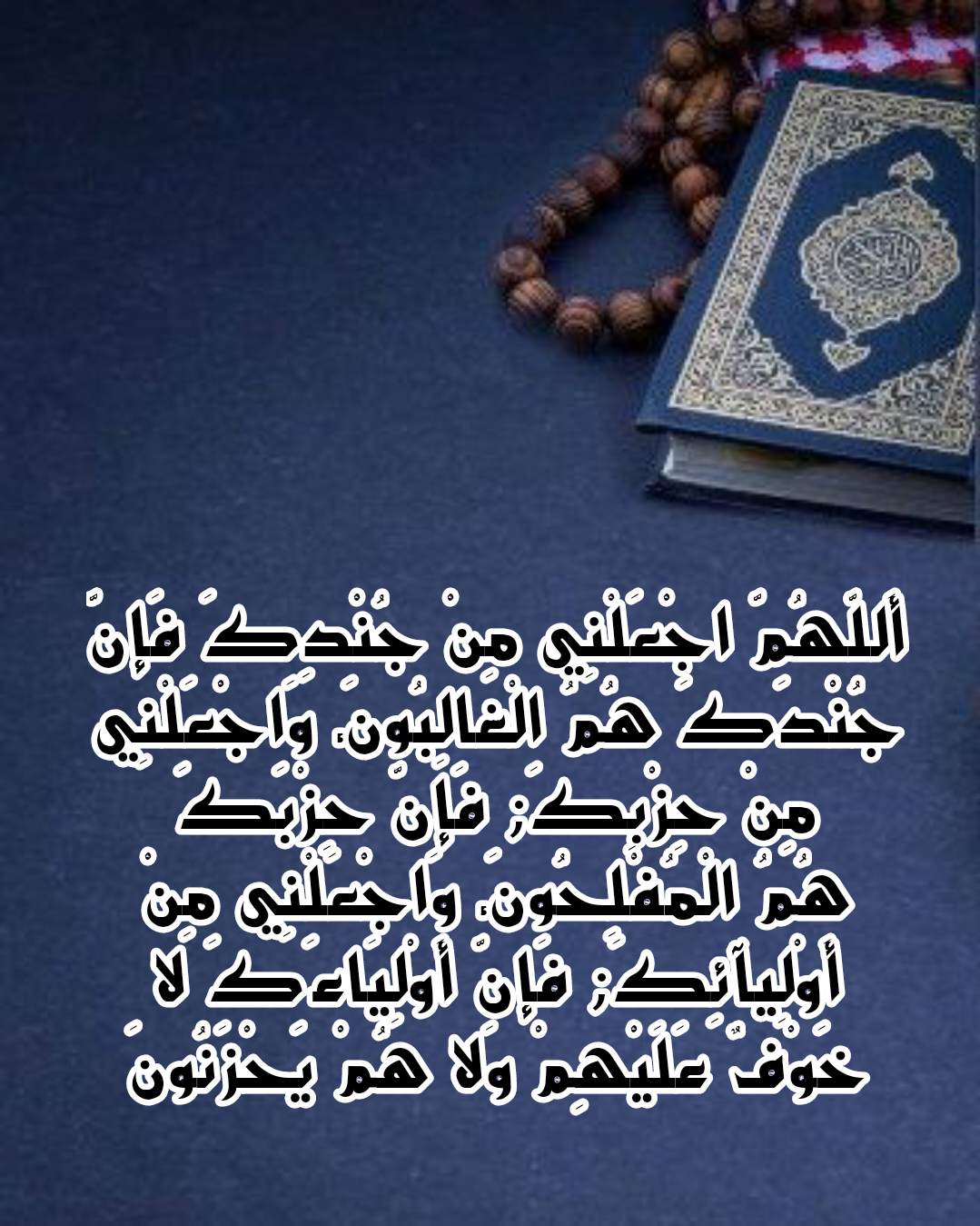 - اللهم اجعل الإسلام مُعَزَّزًا والمسلمين منصورين وكَمِّل لنا نورنا وارضَ عنا يا كريم وثَبِّت قلوبَنا على طاعتك واجعلنا من عبادك الصالحين الذين يتبعون سنة نبيك محمد صلى الله عليه وسلم وحرم أجسادنا على النار واسترنا بسترك الجميل وأمددنا بعونك وقوتك.